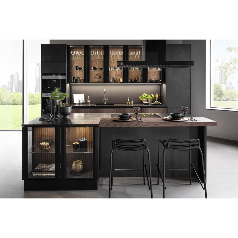 We have selected kitchen furniture sets in two colors, which work perfectly in a modern look. One is black and gray, with glass and wood accents, while the other features a dominant shade with light wood accents. Both are perfectly crafted, made from the highest quality materials.