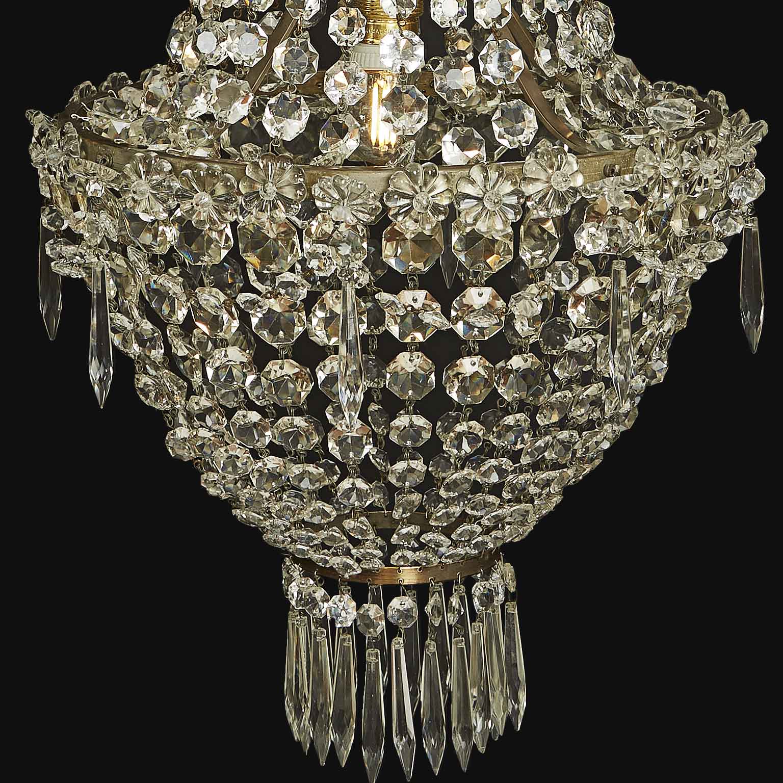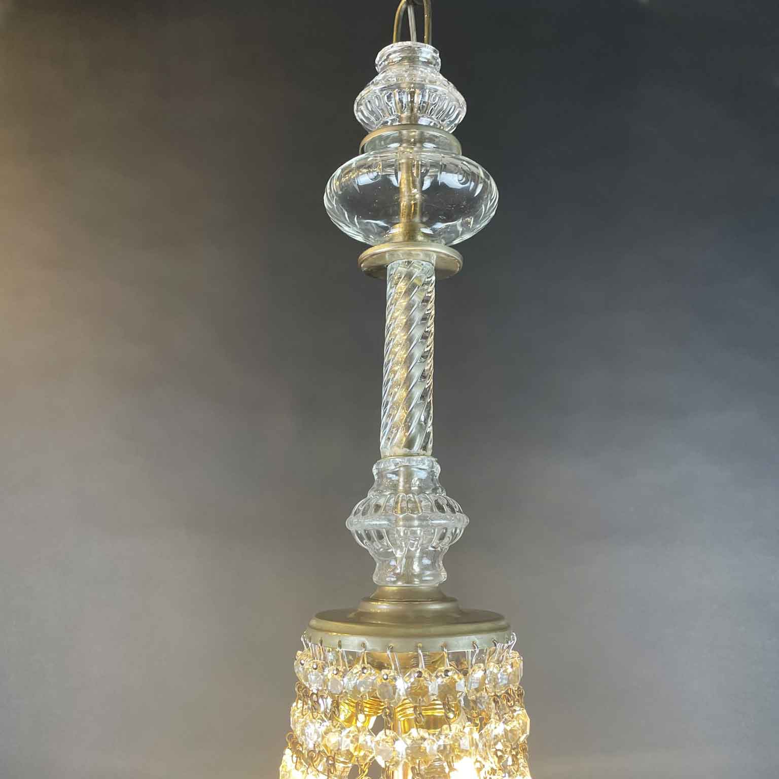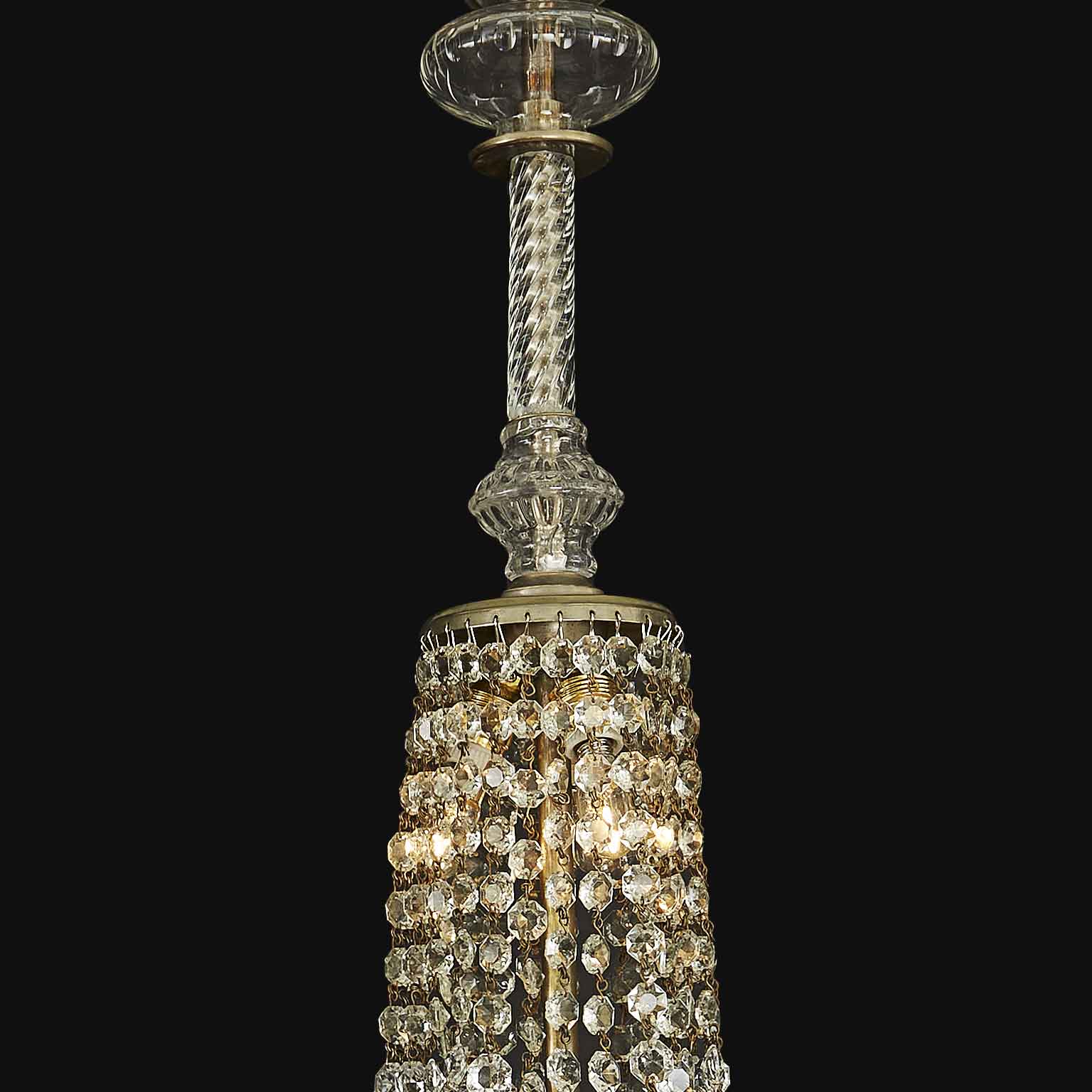 The lights are surrounded by a cascade of crystal octagonal chains of various sizes. It dates from the early 20th century and is in perfect condition, ready to hang. It weighs approximately 8 kg.
