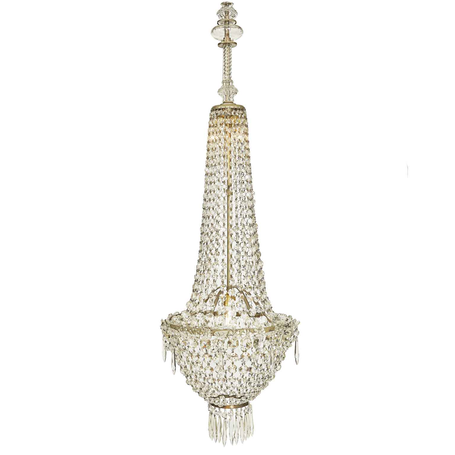 We are pleased to present to you the 1900 Balloon Crystal Chandelier, equipped with three E14 small screw bulbs at the top and a lower light with a large E27 socket.