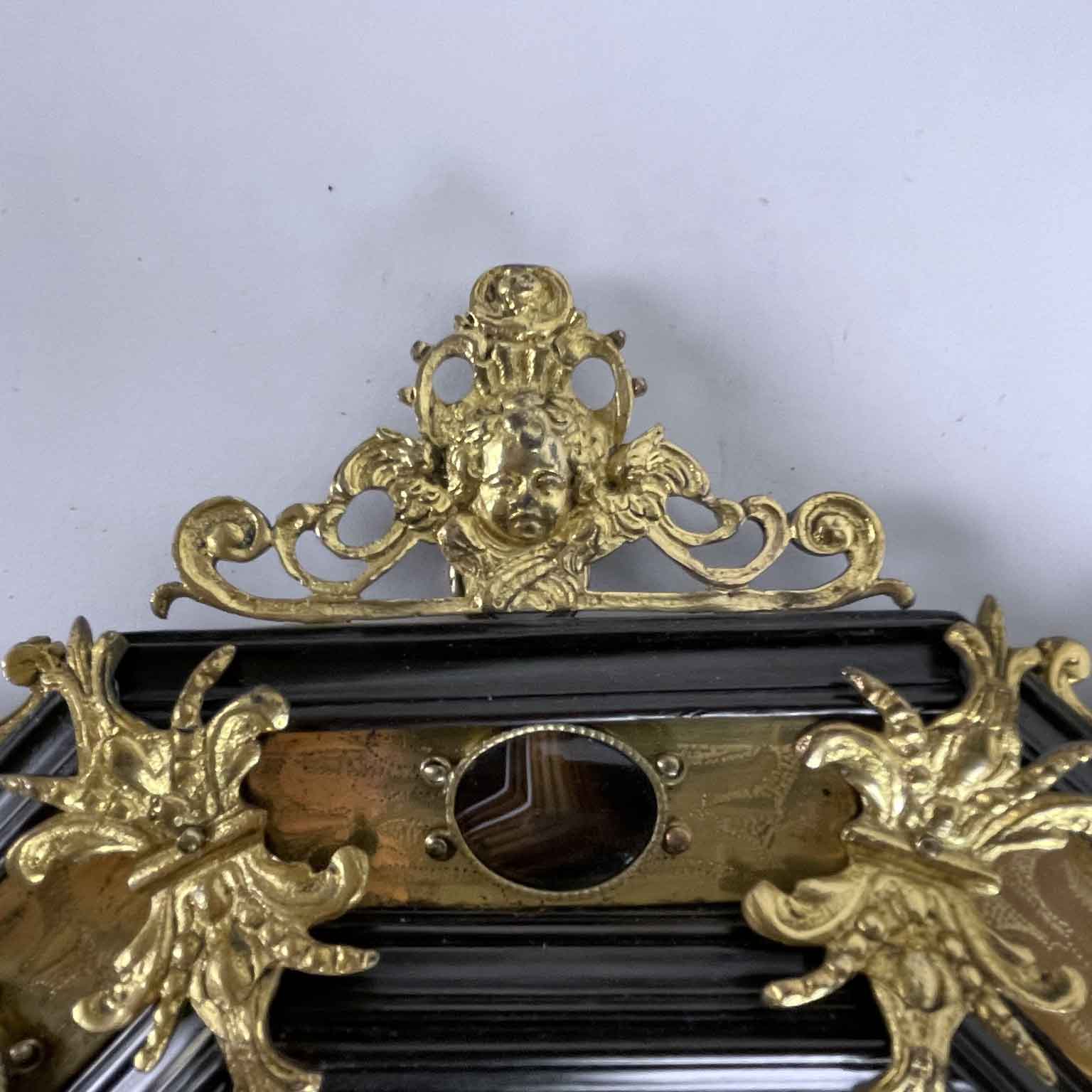 At the two upper and lower ends, where the shells are located, there are gilded friezes depicting the face of a cherub. The inner part is decorated with hard stones, eight striped agates of various qualities, oval and convex, arranged in the middle of each side of this original 17th-century octagonal frame.