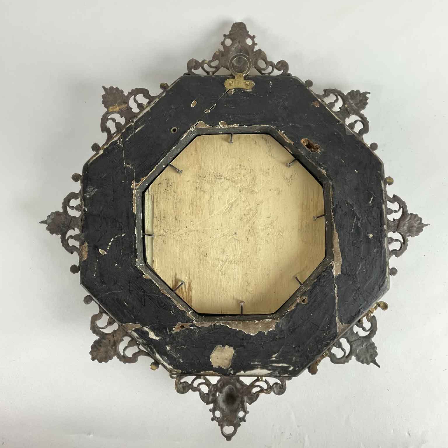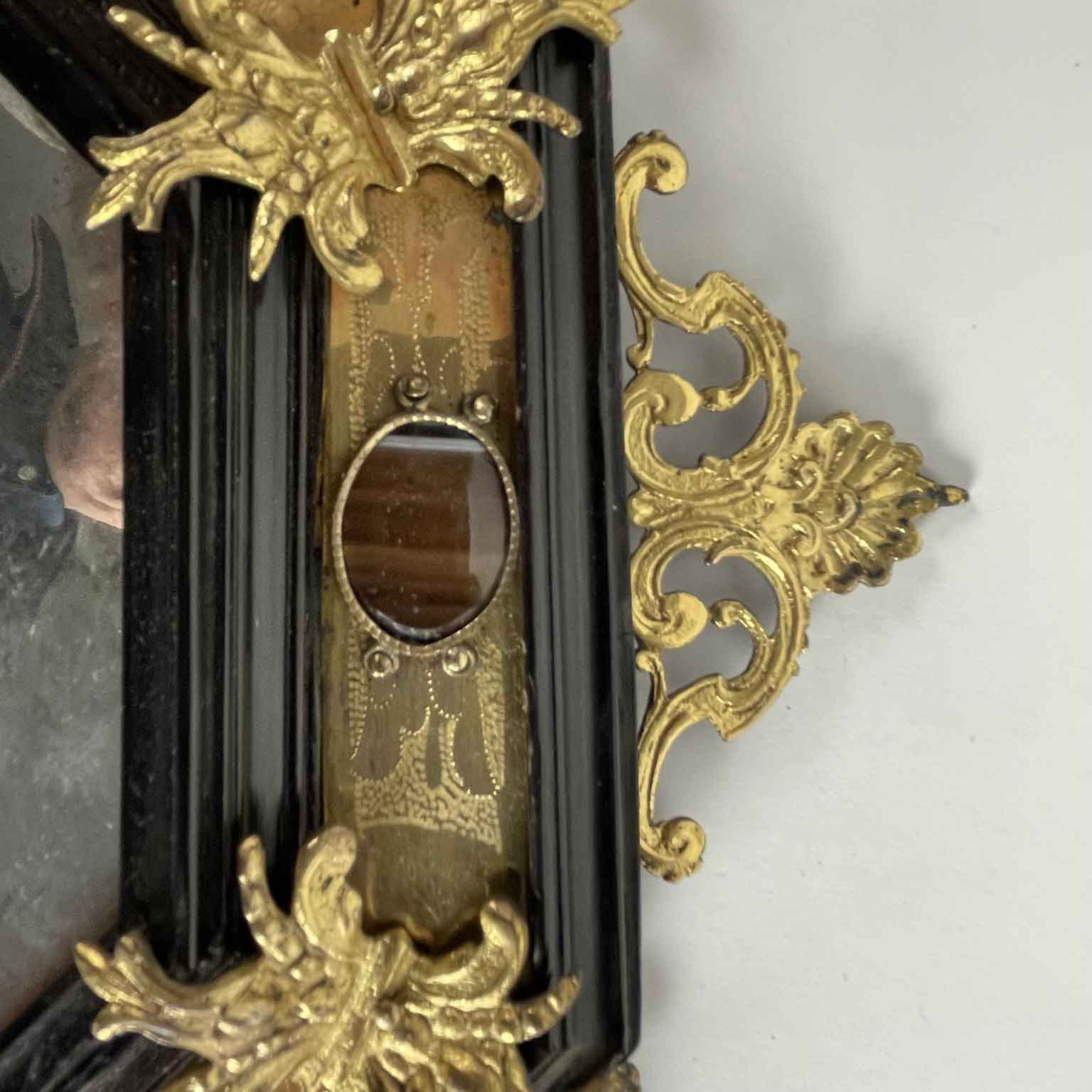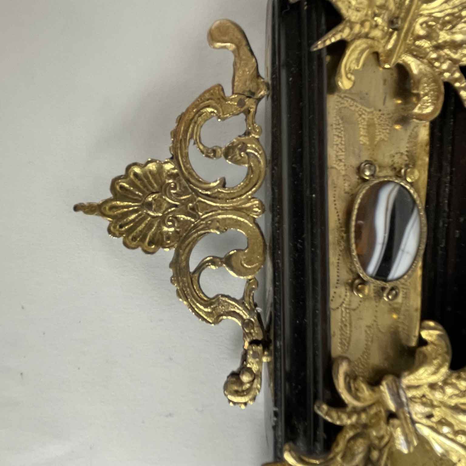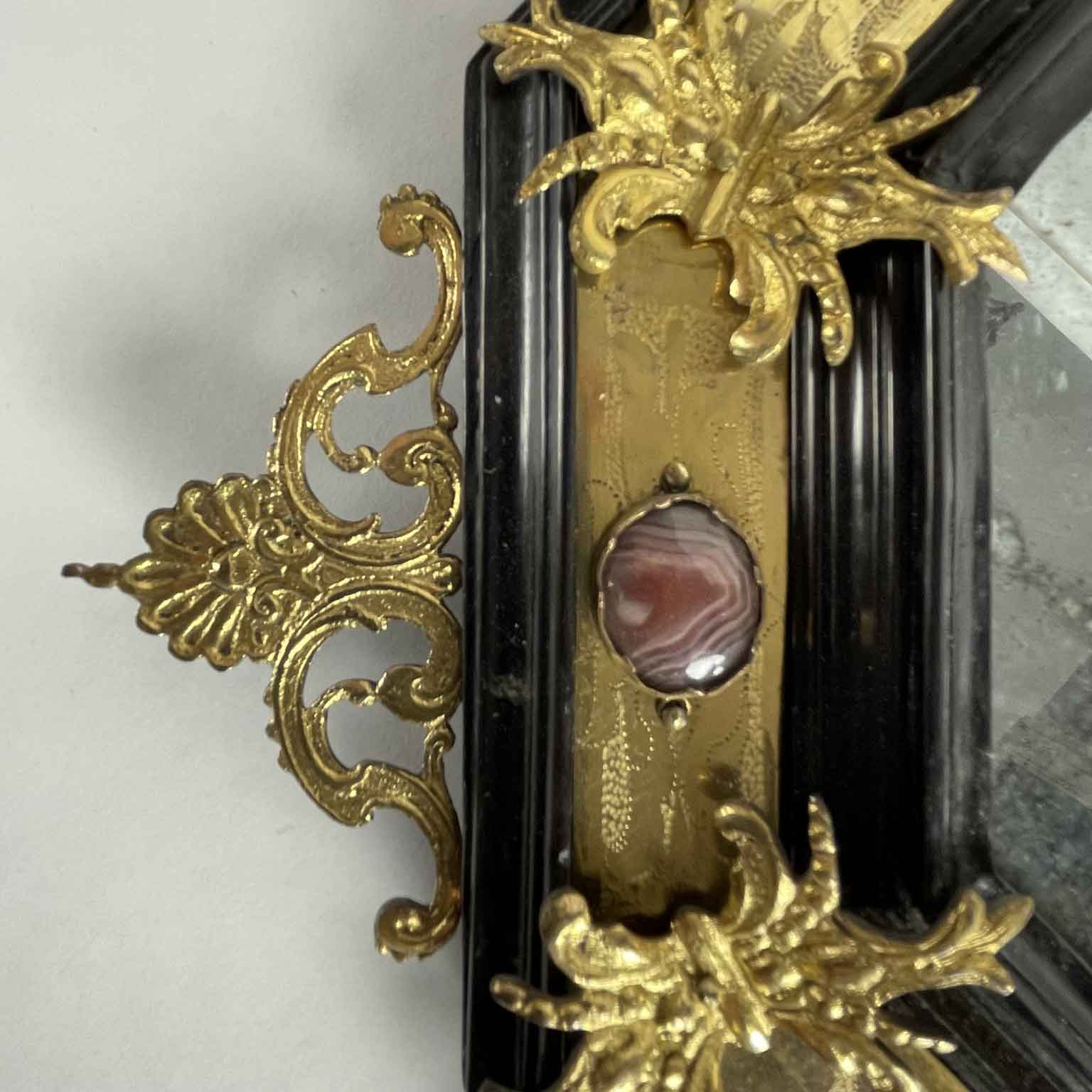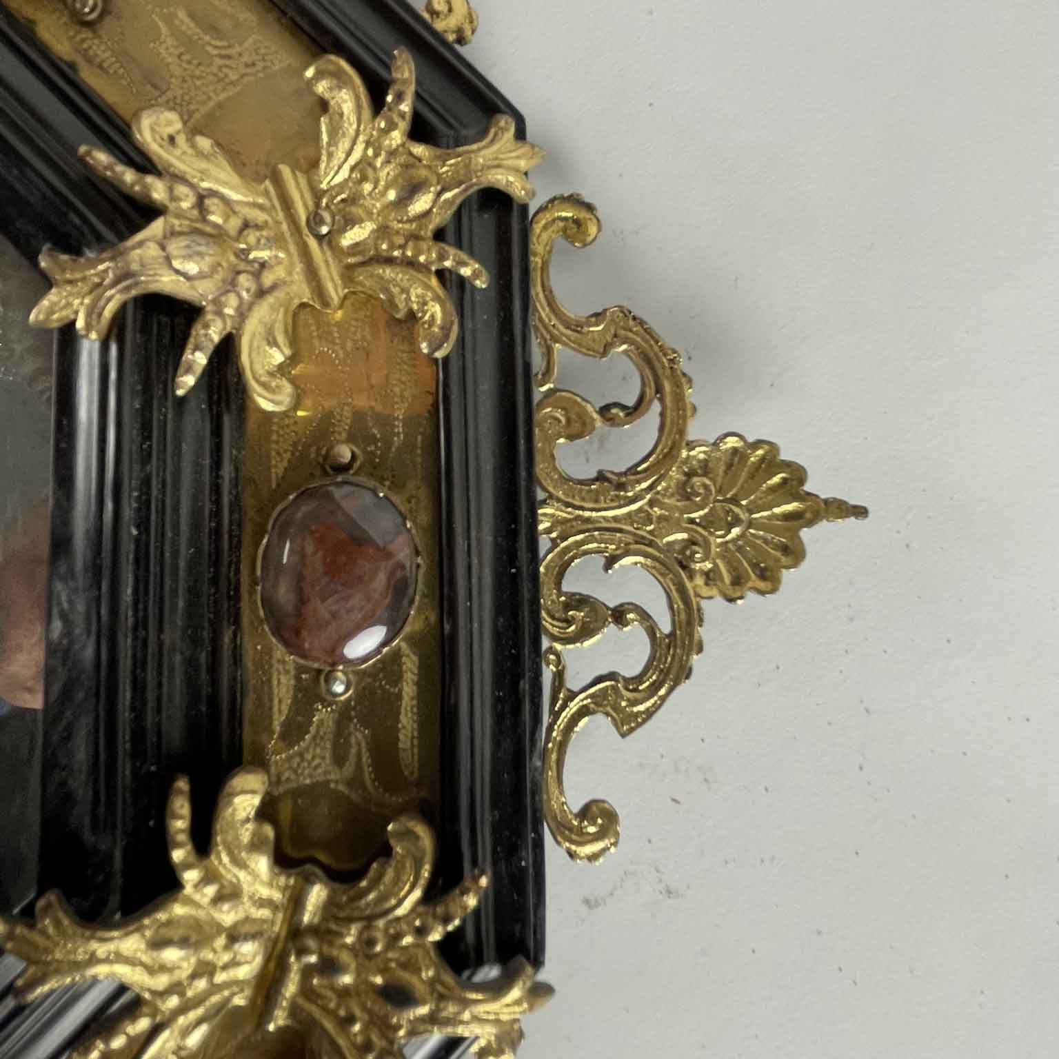 Octagonal antique Roman frame from 1600 with gilded bronze details and hard stones, built in a box of walnut wood with ebonized moldings; it is entirely covered with engraved and gilded copper plates with cast bronze finishes placed at the corners. Similarly, on the outer perimeter along the central line of the sides, there is a carved molding consisting of two volutes connected by a shell — one at the bottom left has been restored; identical applications can be found in an ancient similar frame on the website. 105 Directory of the European Frame edited by A. Montanari and R. Lodi, Correggio 2003.