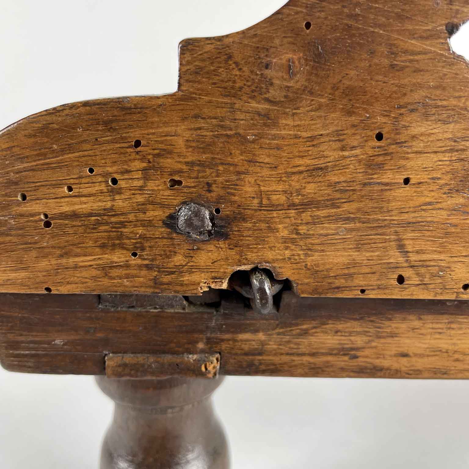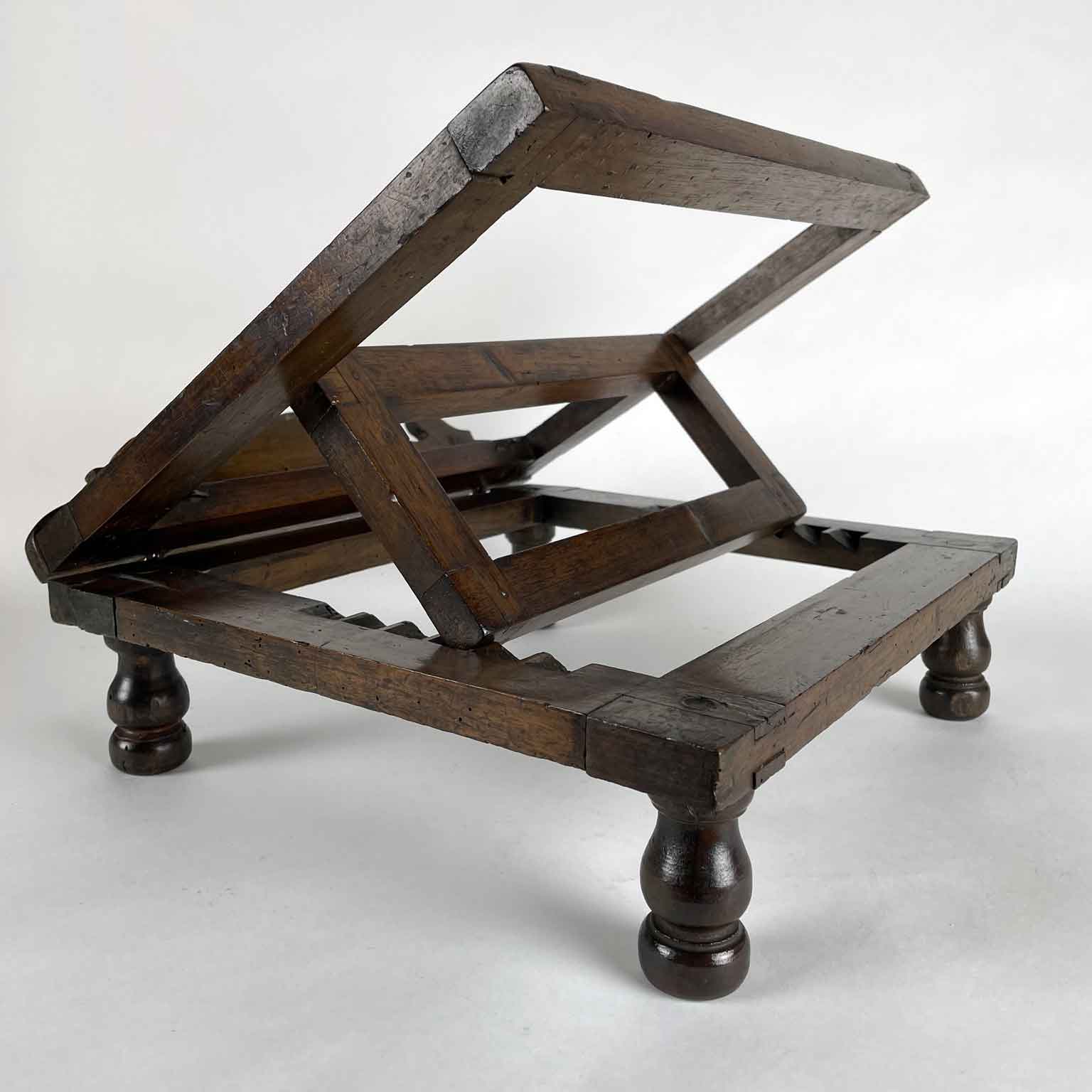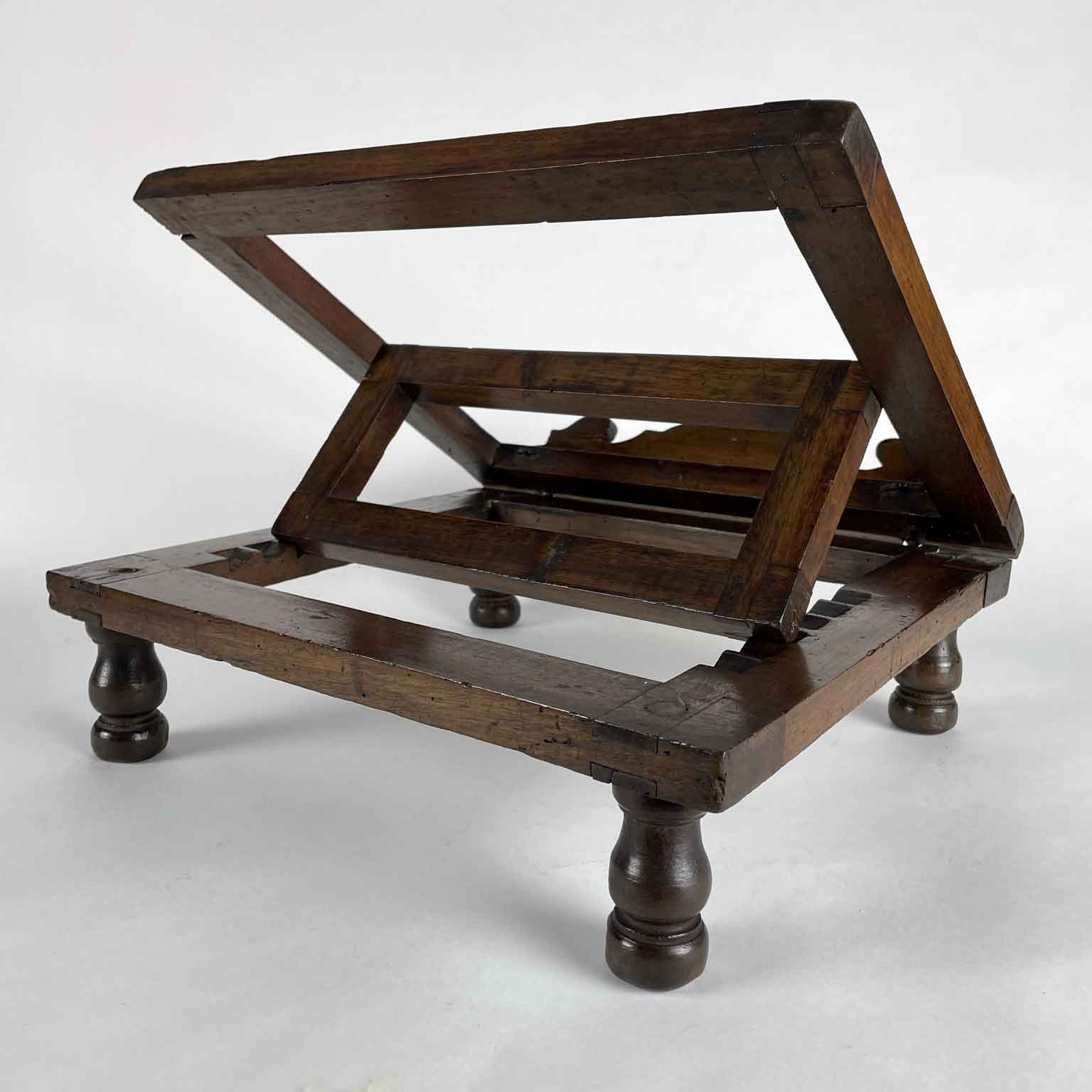 This is a walnut side desk resting on four turned spindle legs with an adjustable tilt, featuring a shaped side for books. In good condition with an old restoration. Likely of liturgical origin, dating from the early 19th century from northern Italy.