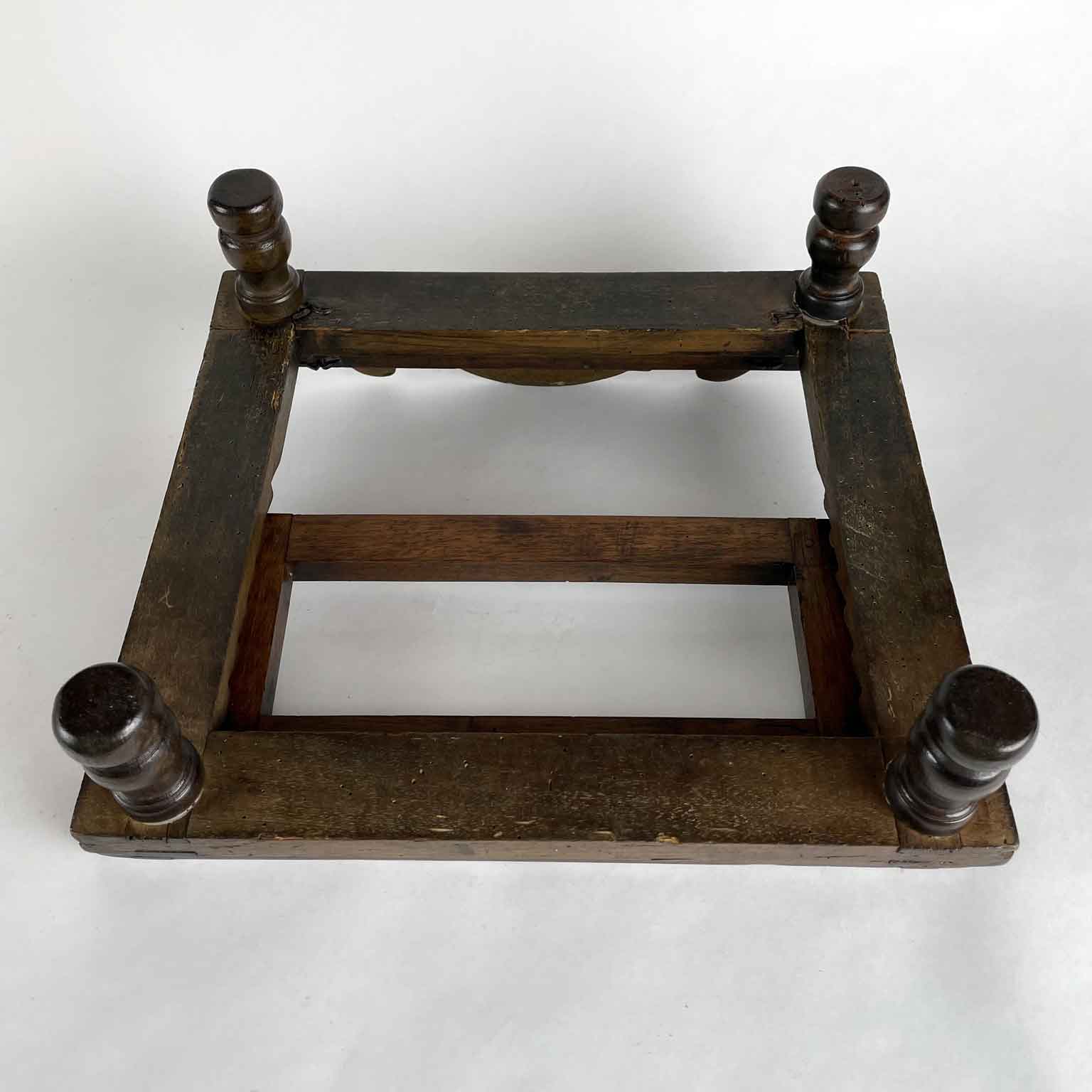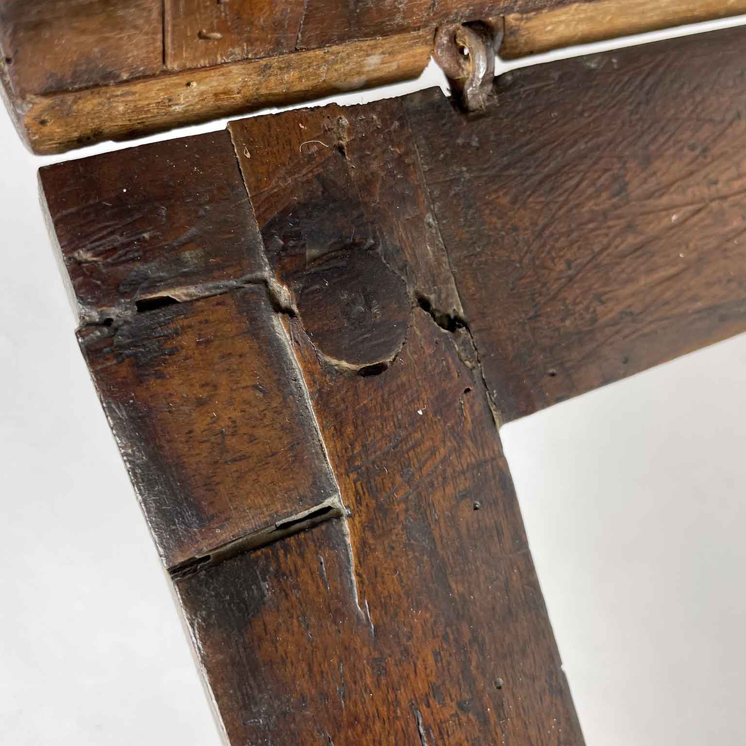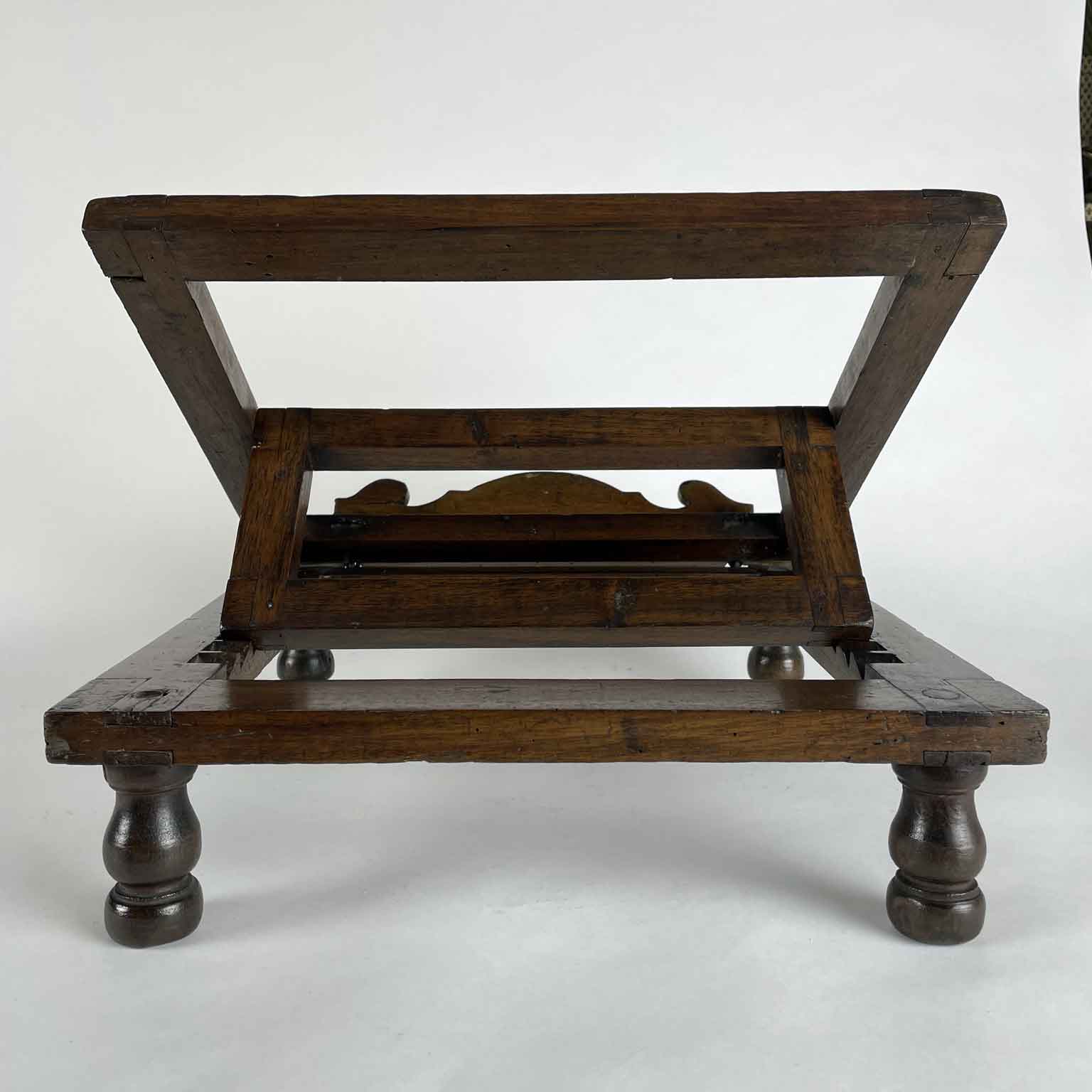 This is a walnut side desk resting on four turned spindle legs with an adjustable tilt, featuring a shaped side for books. In good condition with an old restoration. Likely of liturgical origin, dating from the early 19th century from northern Italy.