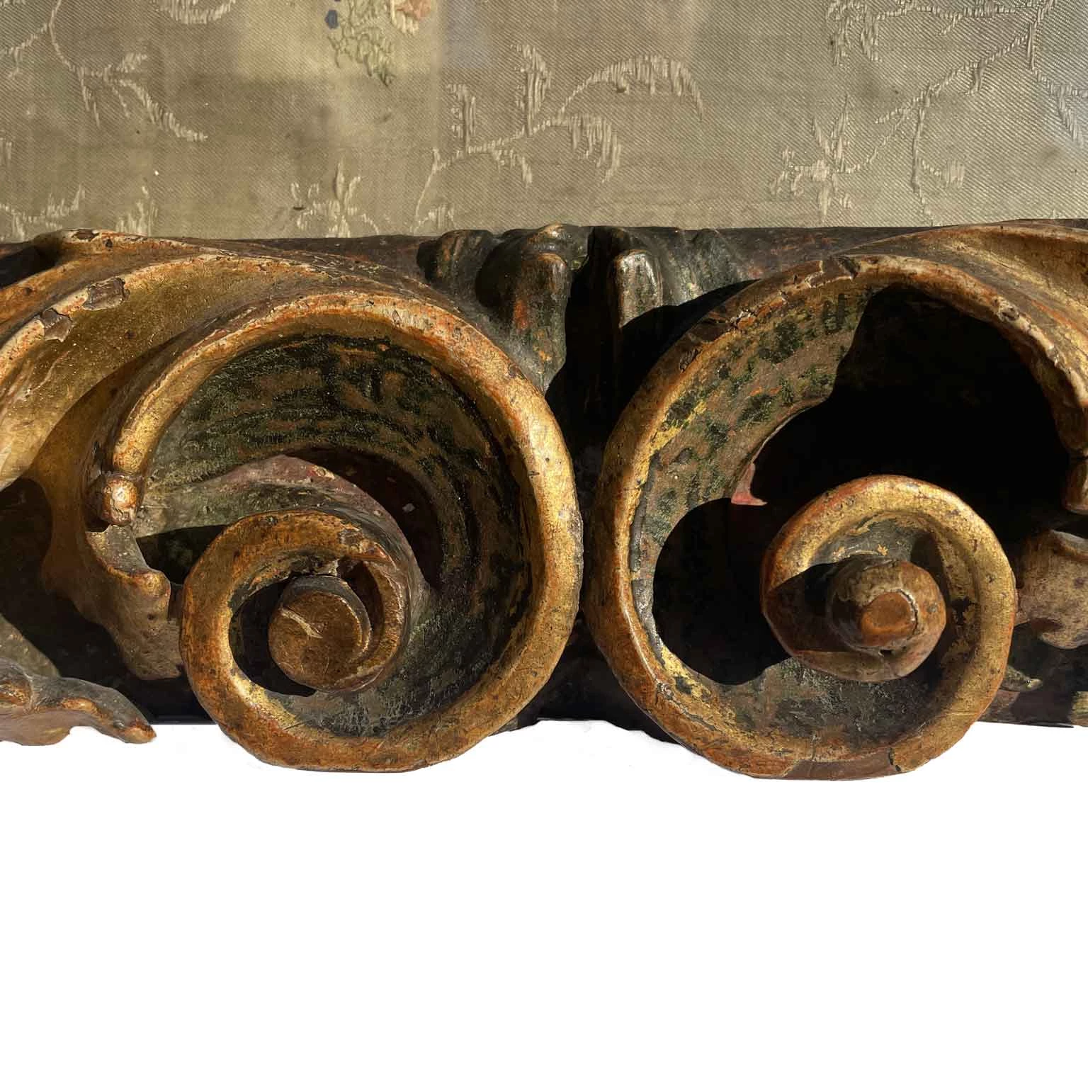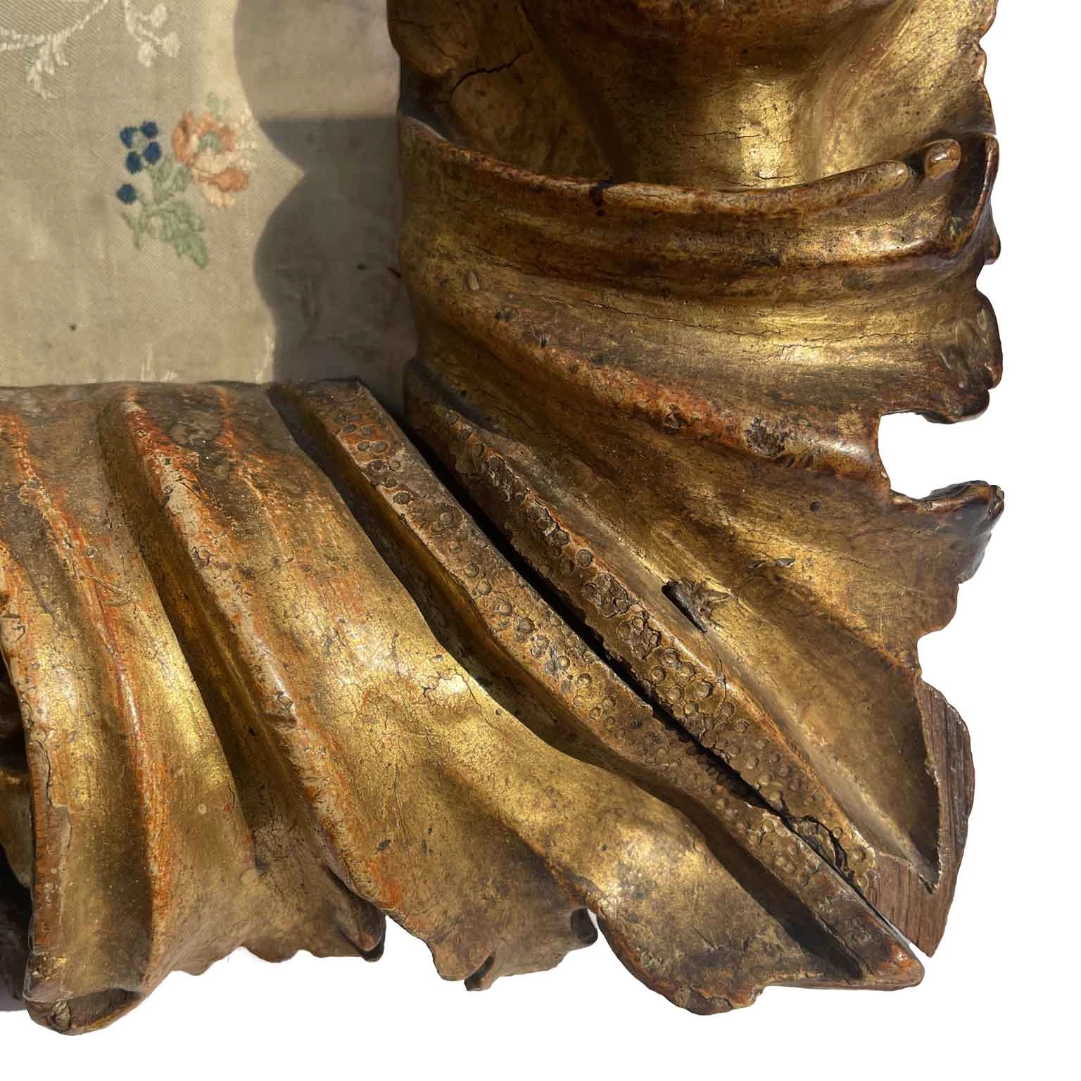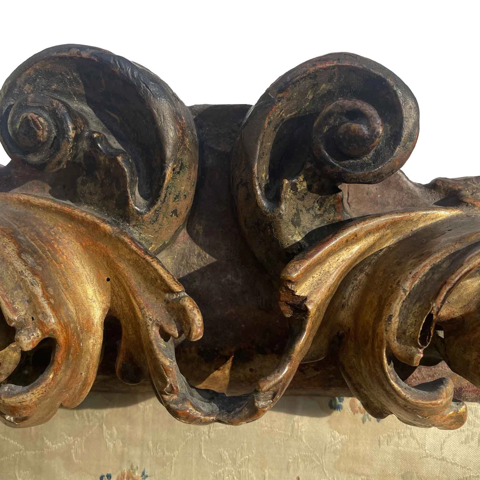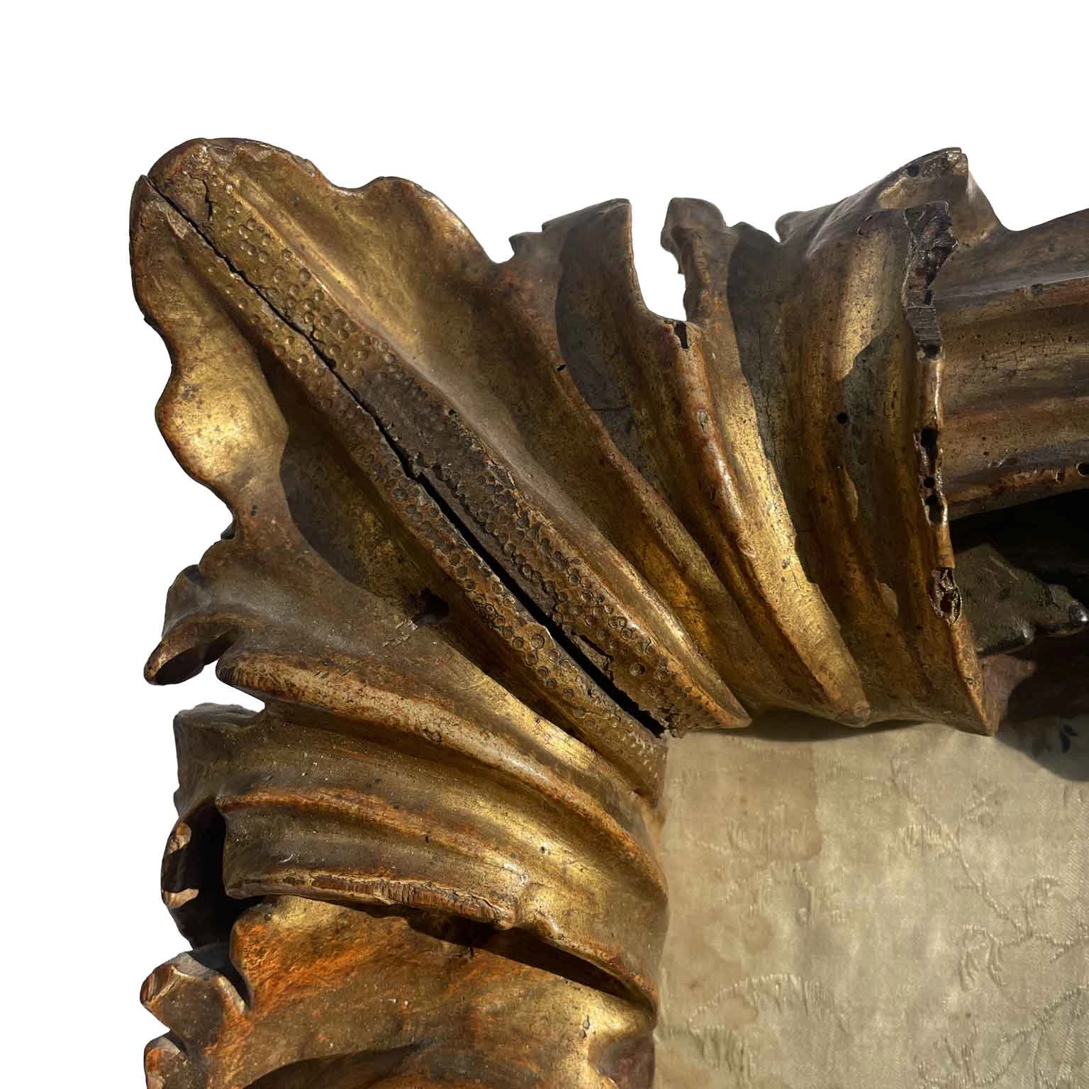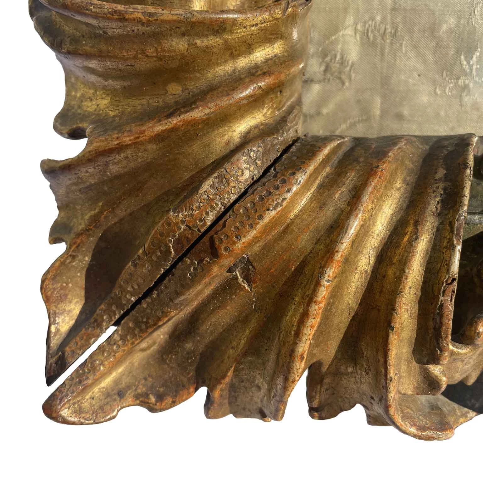 Baroque Cartoccio frame in a rectangular shape, created by deep volutes connected by two central keys and foliage with engraved ribs in the corners. Gilded for gouache with an Armenian red bole preparation. Inside, there is a centered textured fabric embroidered with small colorful flowers. Well-preserved, despite minimal defects consistent with 17th-century dating, it comes from Milanese collections.
