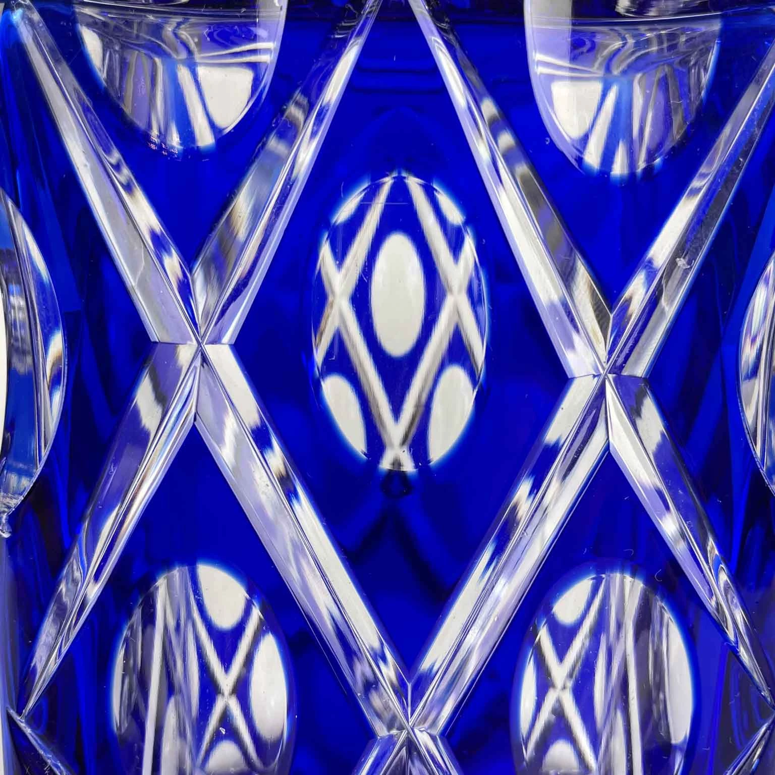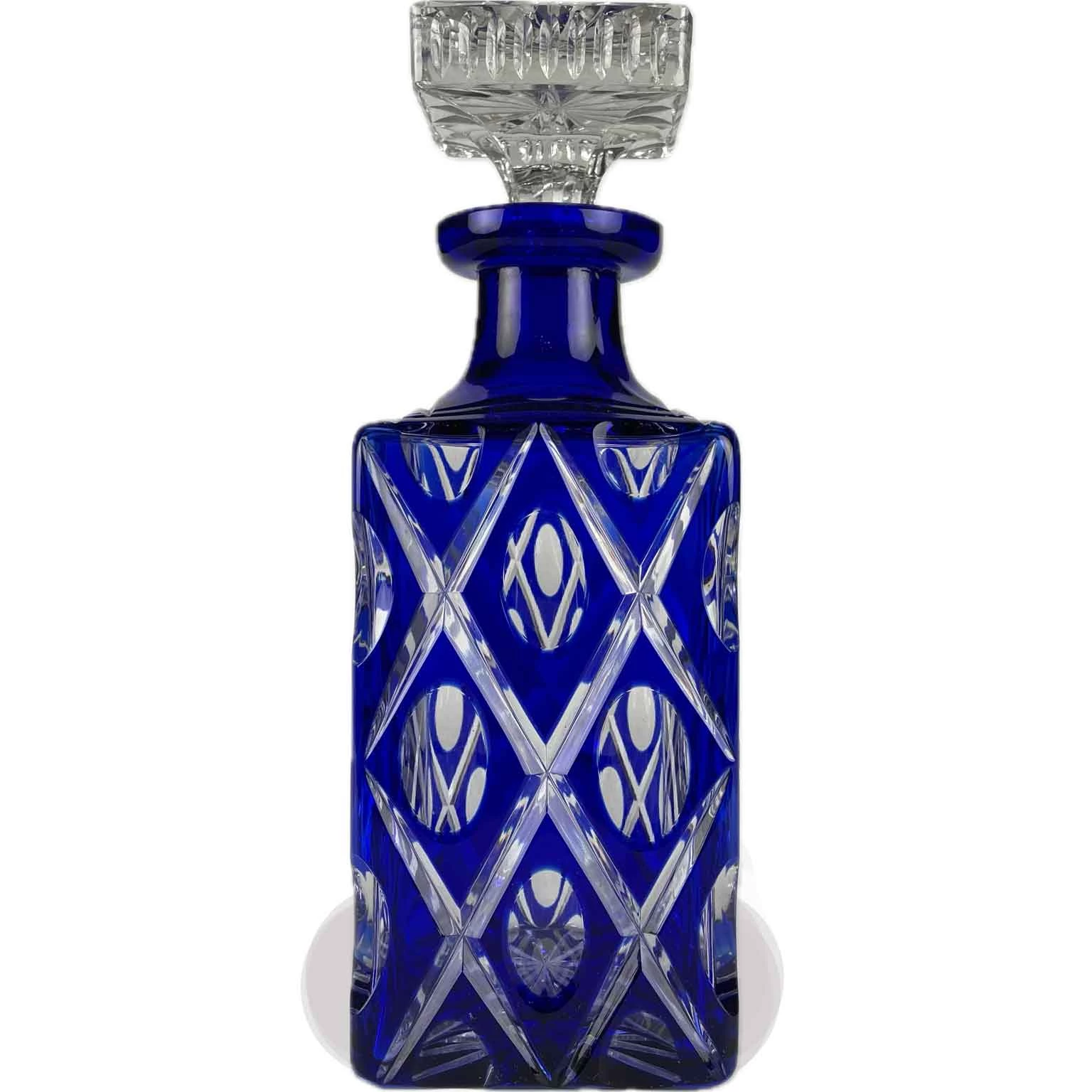 This beautiful alcohol bottle made of blue crystal features geometric, diagonal, rhombic, and oval motifs — emphasizing the contrast between the transparent, faceted crystal surface and the cobalt-blue exterior surface.