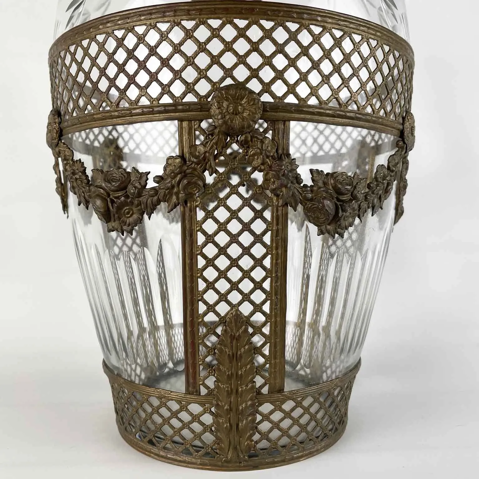 Brass plate is perforated and adorned with embossed floral motifs intertwined with faceted glass decorations. In good condition, without chips or cracks. Italy, circa 1930s.