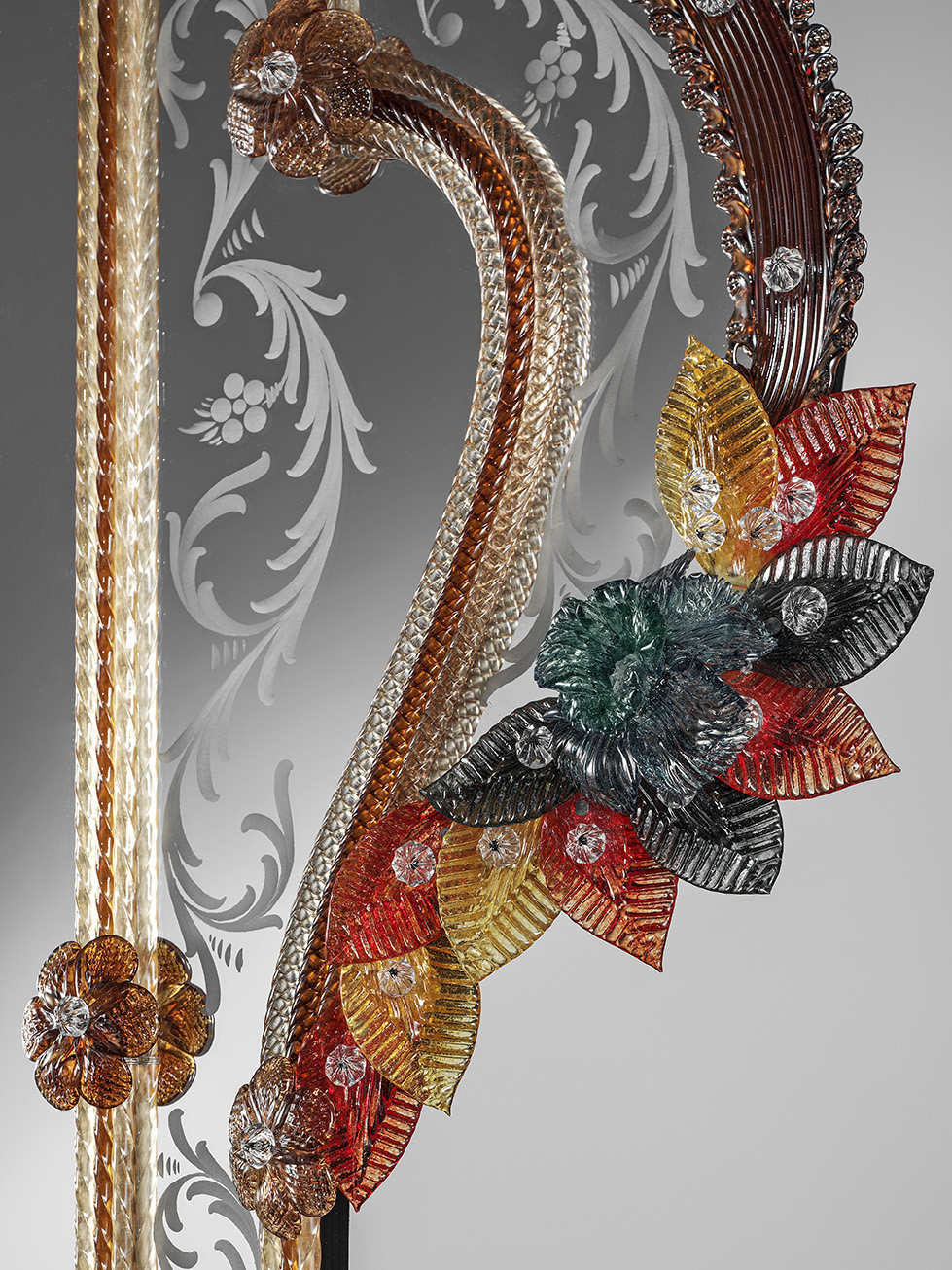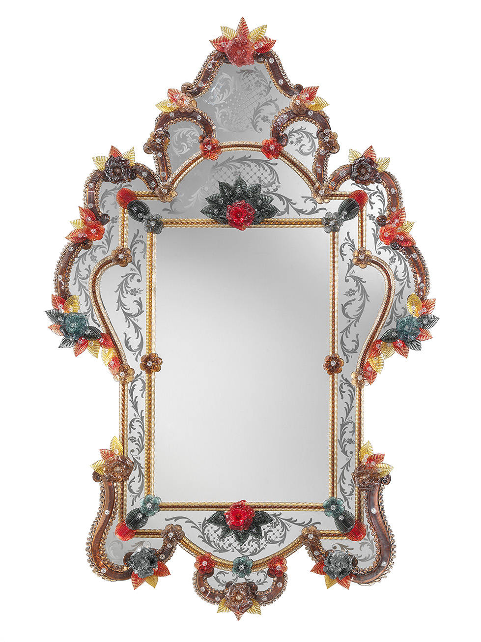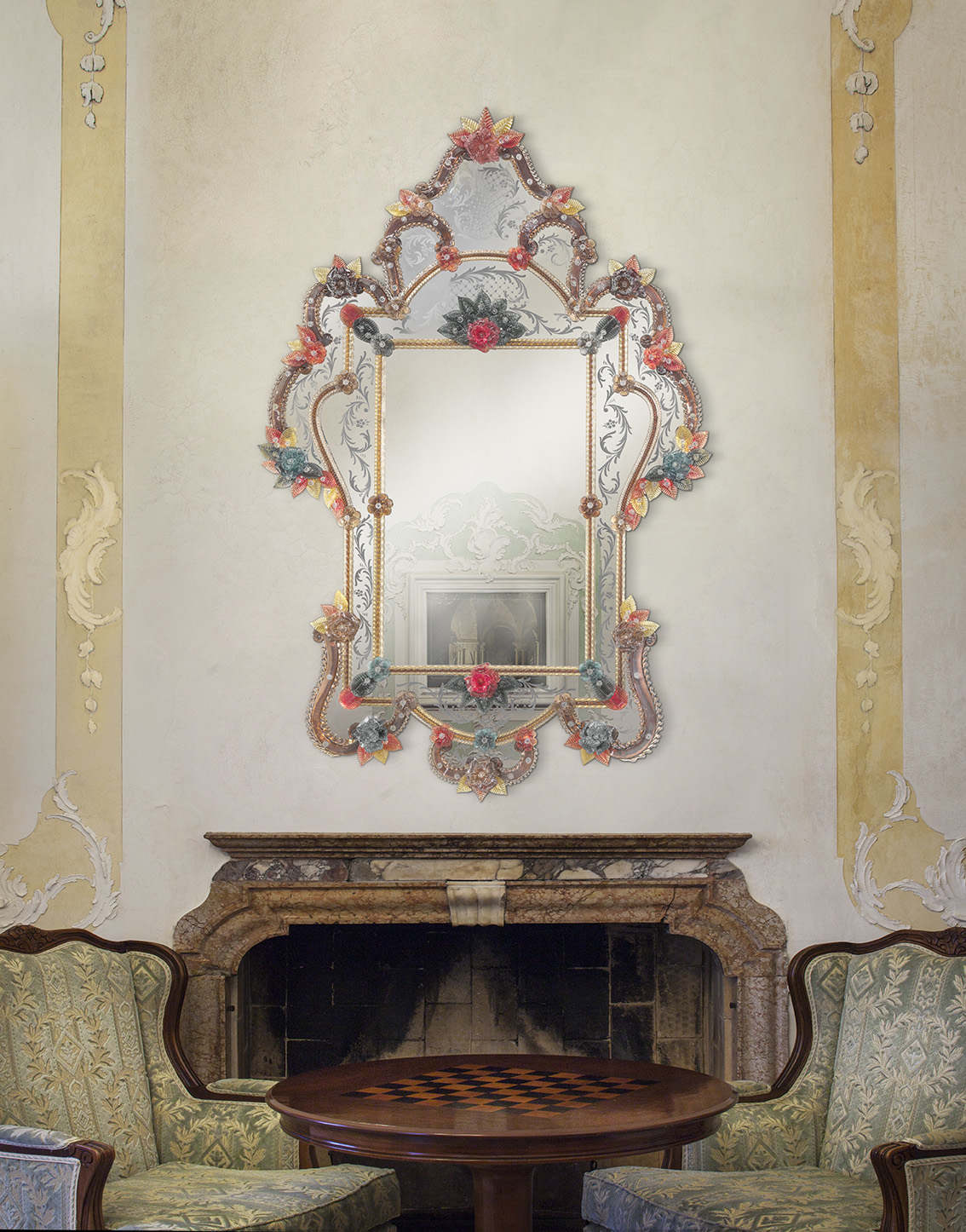 Only the highest quality materials are used in the production of Italian mirrors. Besides Murano glass, this includes mirror glass, wood, and 24-karat yellow gold. Individual models may differ in size, shape, and decorative details. Such mirrors are perfect for interiors decorated in palatial, English, Baroque, or glamour styles. They can be hung in the living room, hallway, bathroom, dining room, or bedroom.