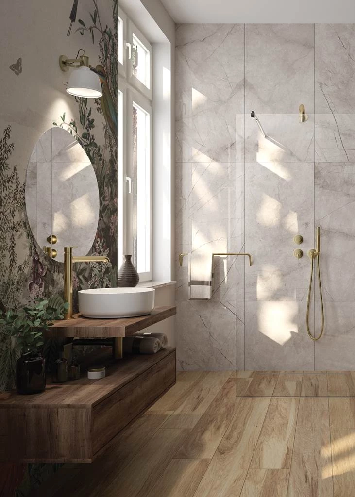 Wood-effect tiles are an excellent substitute for natural material in areas around the bathtub and under the shower. Photo: Cersanit.