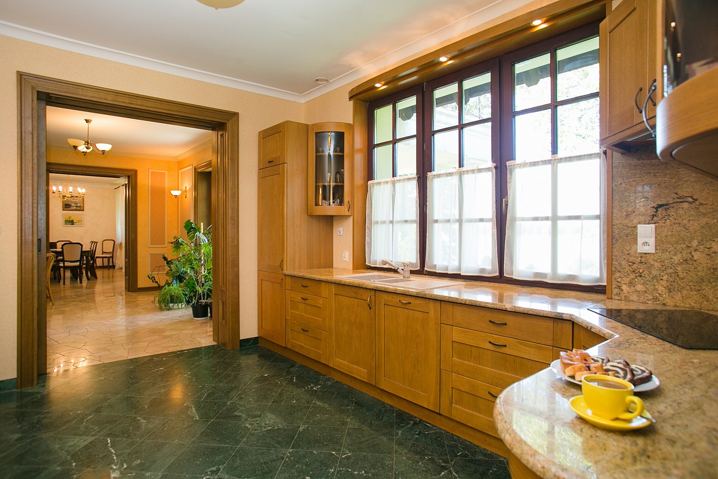 Entering the house, you pass through a portico with a spacious terrace. Inside, you are greeted by a bright, high foyer with open stairs decorated with a wrought-iron balustrade, leading to the upper floor where the bedrooms are located. From the foyer, a corridor to the right leads to the bathroom, study with a library, and the kitchen, which has a passage to the pantry. Straight ahead, you enter the dining room open to the kitchen and living room on the left. The dining area can be separated from the other rooms by stylish sliding glass doors. From the dining room, there is also an exit to the terrace at the back of the house, offering a beautiful view of the lake. The living room, as the largest room in the house, is very well-lit thanks to double windows facing north and south. This excellent relaxation area, with a classic marble fireplace, will make even the longest winter evenings enjoyable.