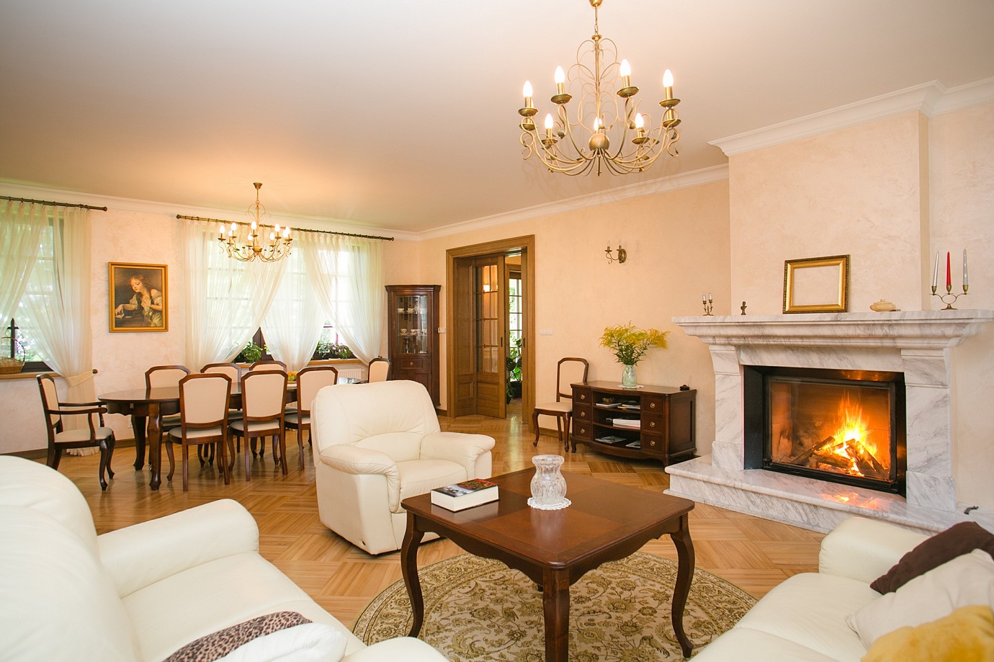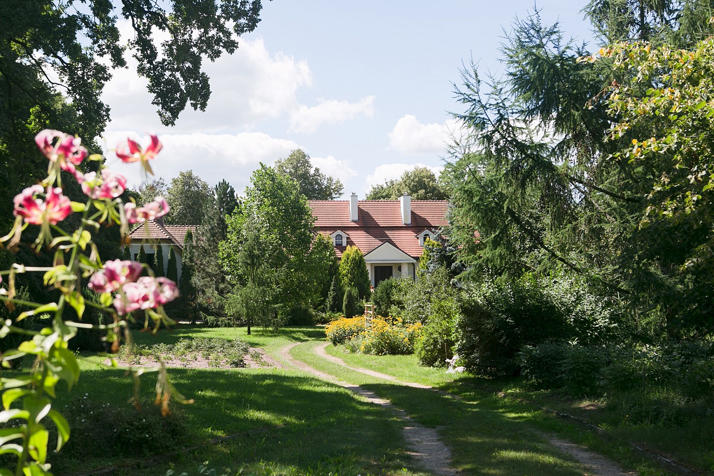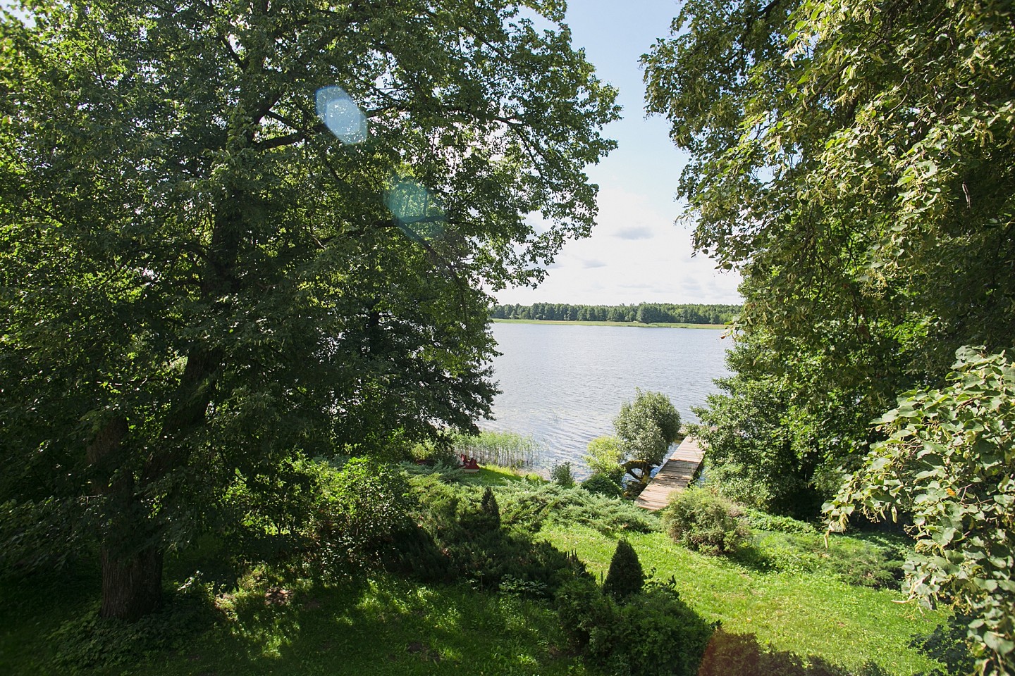 We would like to invite you to Lake Gremzdy near Sejny, where in the village of Smolany Dąb, amidst a beautiful private park, there is a luxurious house built in the style of a classic manor. The entire estate is situated on a fenced, landscaped plot of 20,100 m2, with direct access to the 63-meter shoreline of the lake.