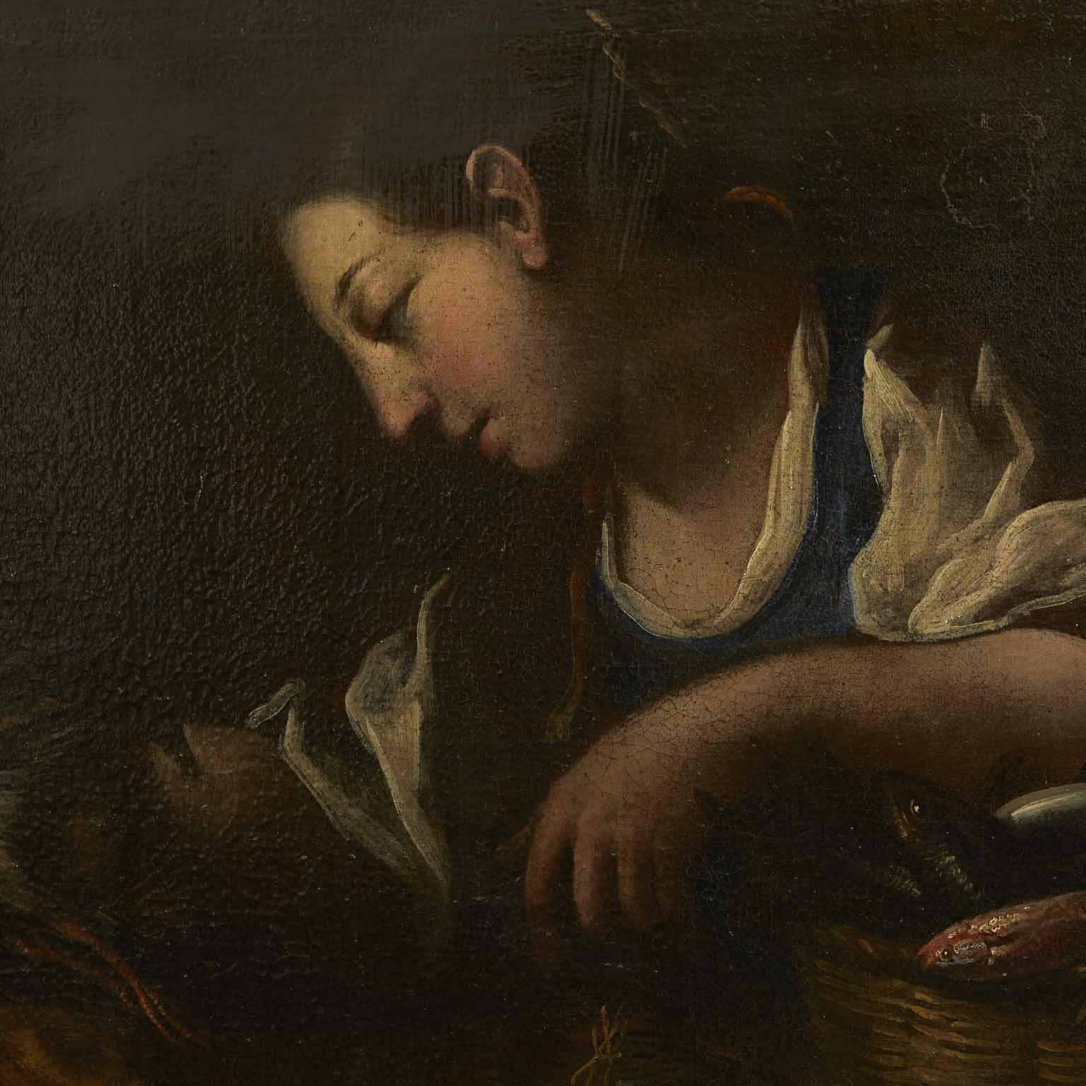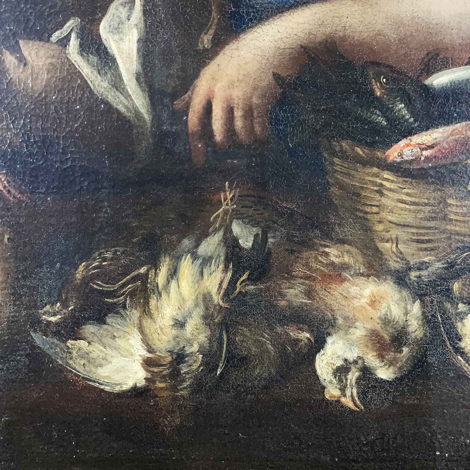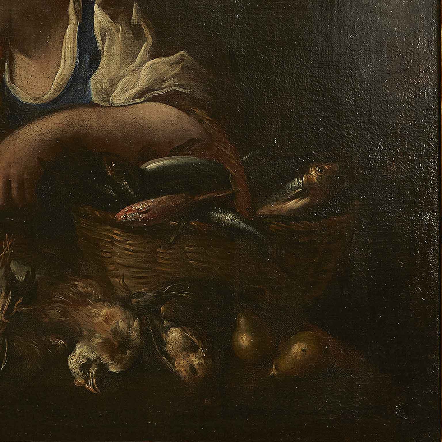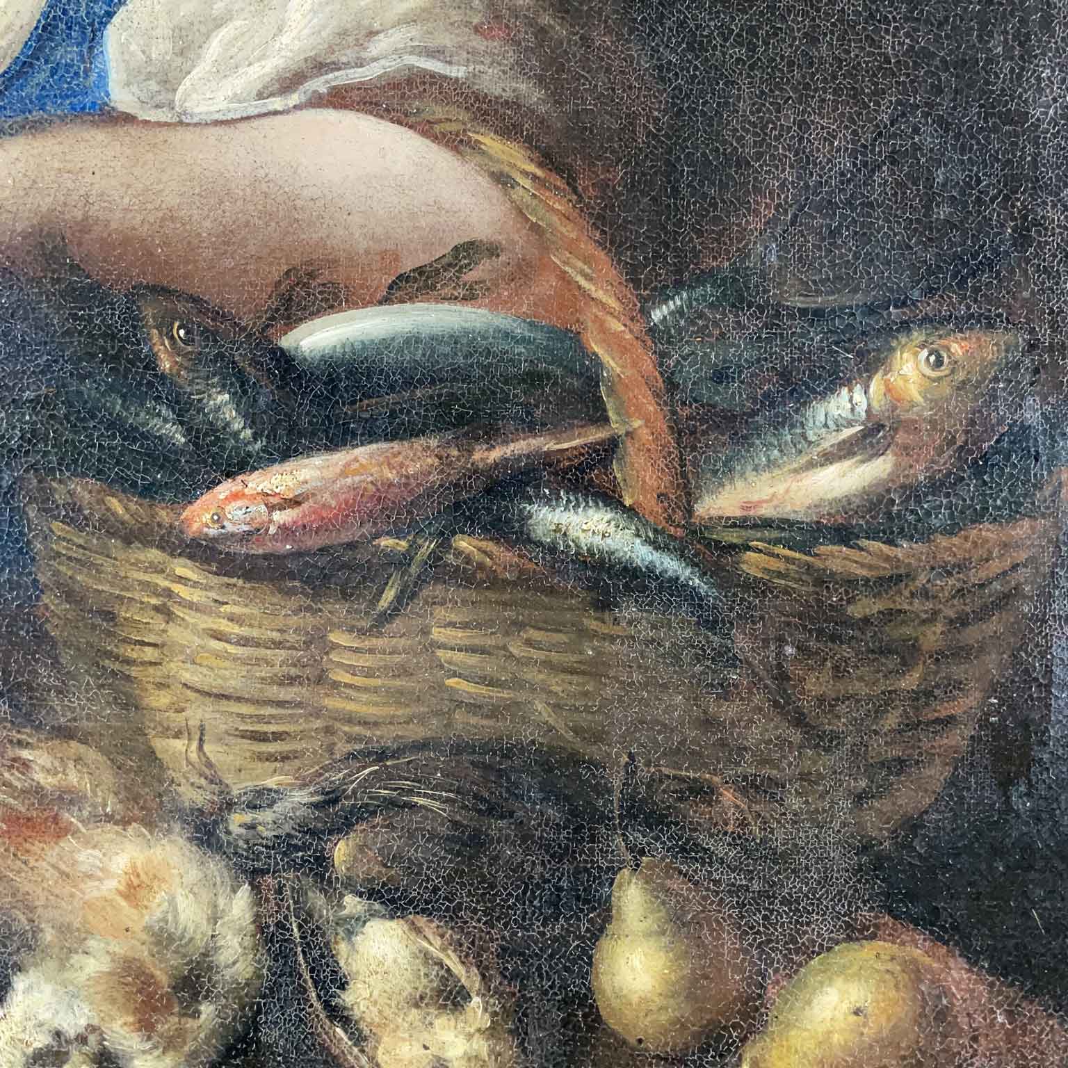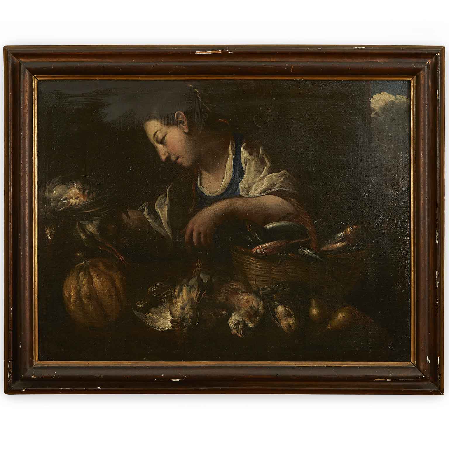 A painted work on canvas featuring a female figure with a wicker basket on her left arm, containing various types of fish and a bird held in her right hand. In the foreground, a composition of another bird, a pumpkin, and pears. The 17th-century painting originates from a Lombard residence and is presented in a contemporary frame, in good preservation condition consistent with its late 17th-century age.