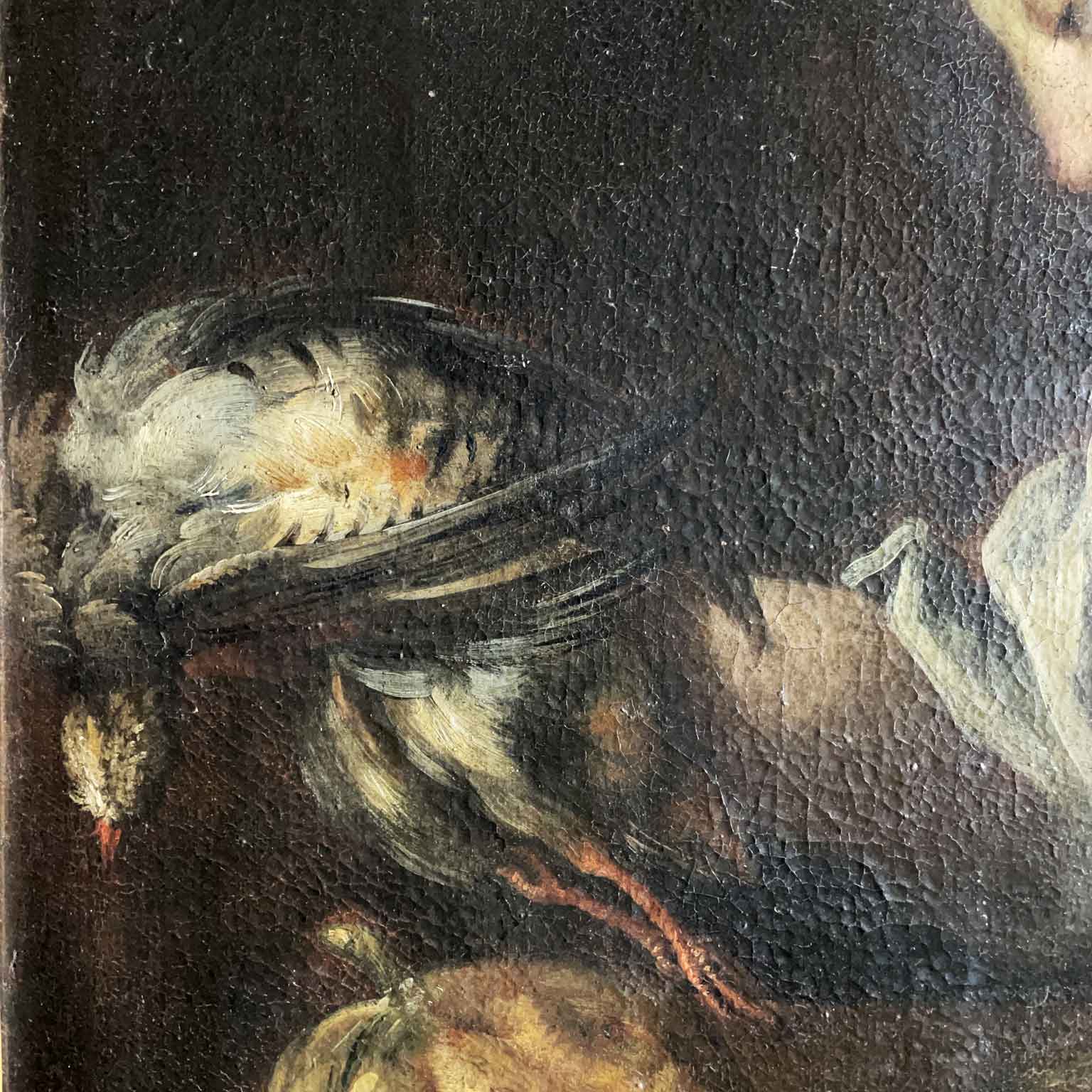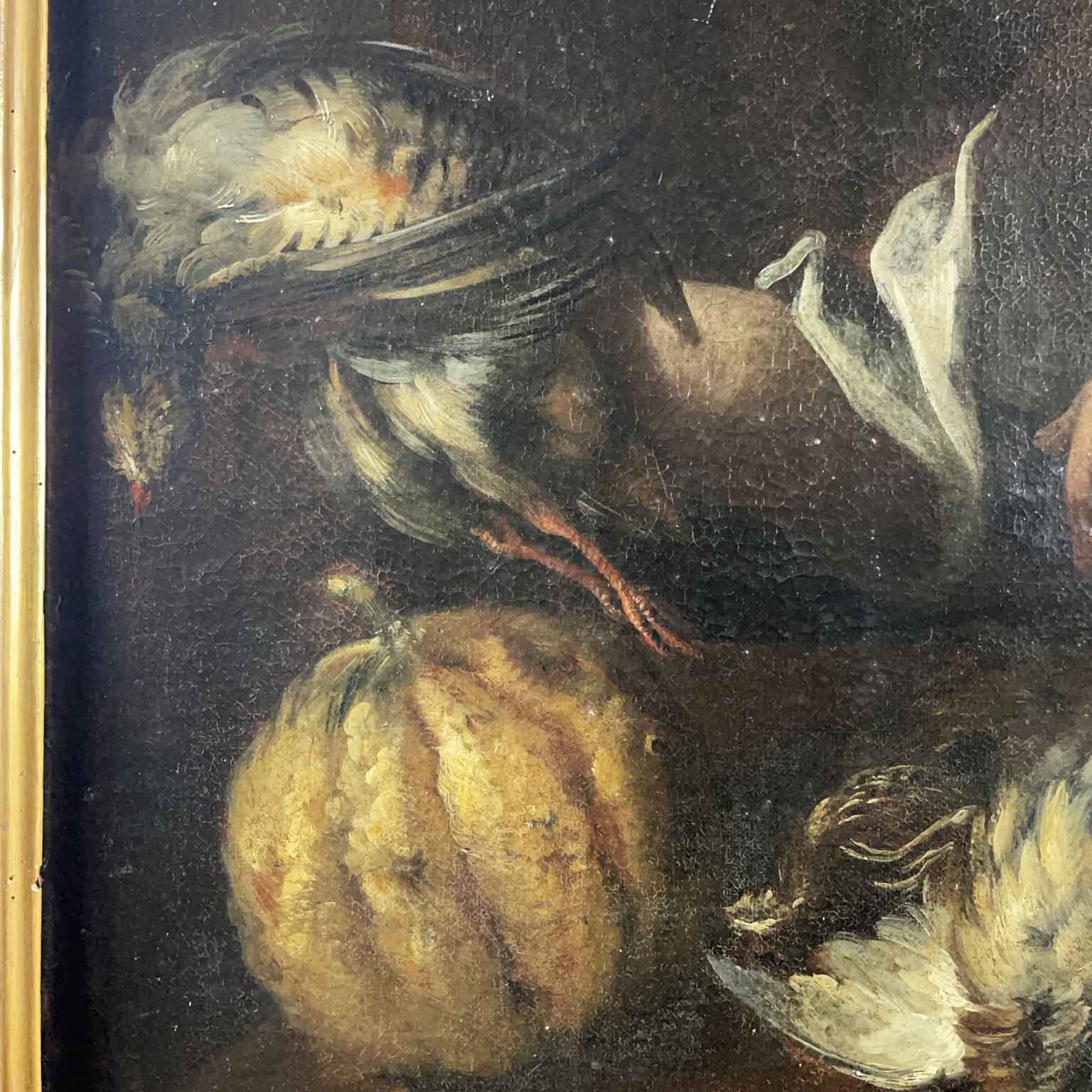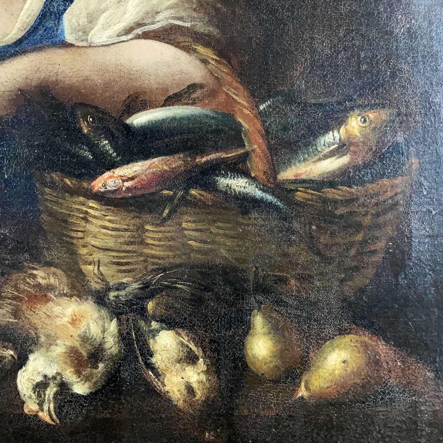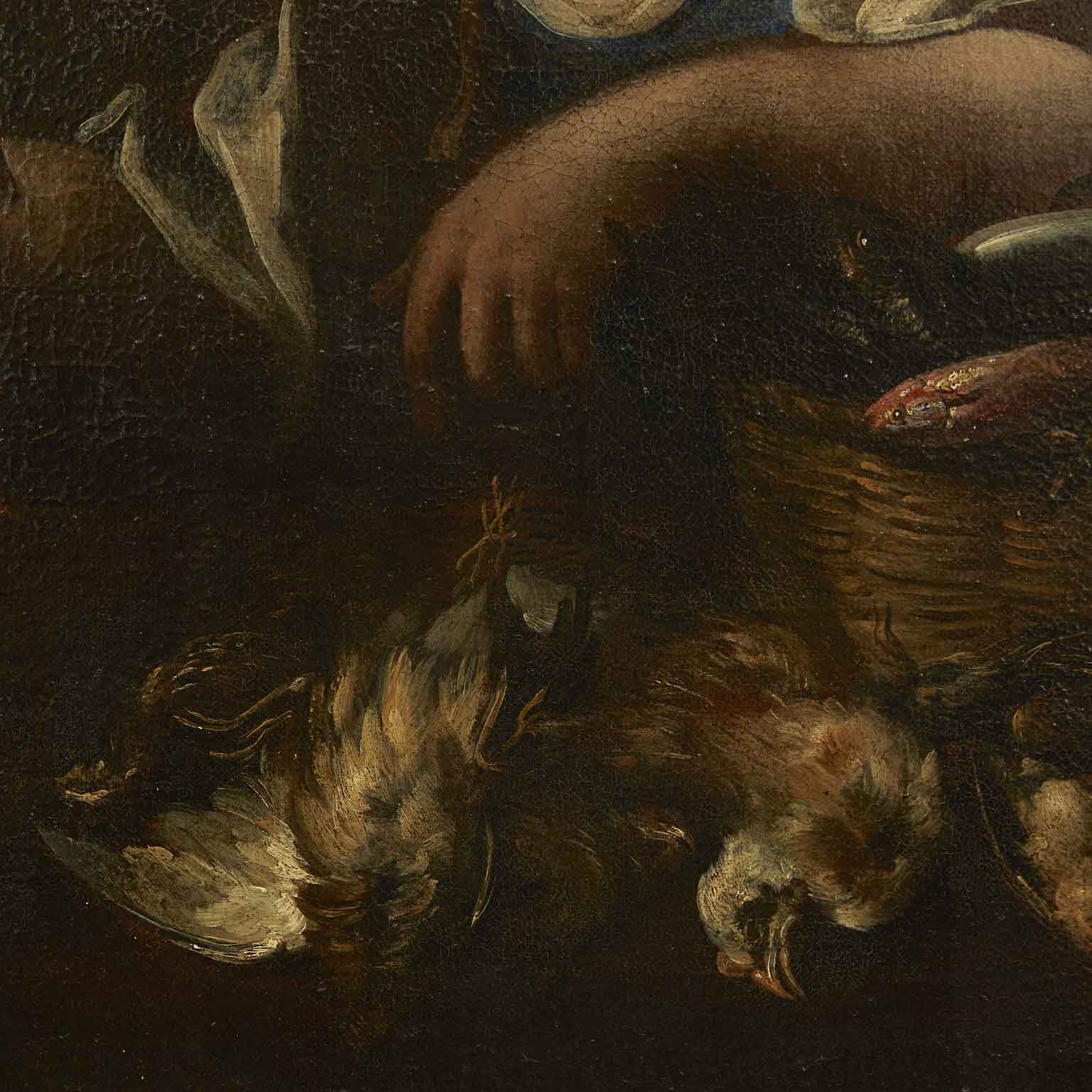 A painted work on canvas featuring a female figure with a wicker basket on her left arm, containing various types of fish and a bird held in her right hand. In the foreground, a composition of another bird, a pumpkin, and pears. The 17th-century painting originates from a Lombard residence and is presented in a contemporary frame, in good preservation condition consistent with its late 17th-century age.