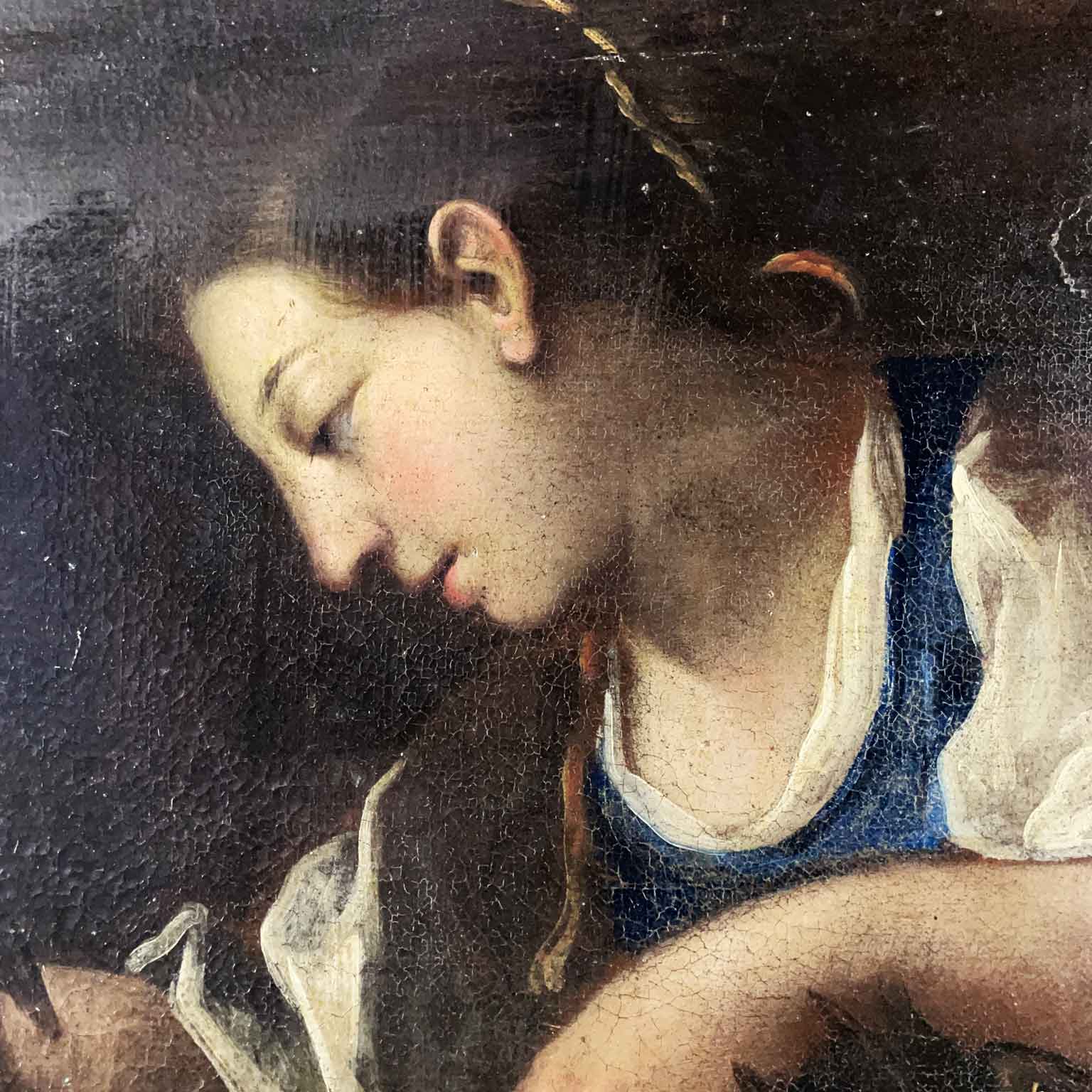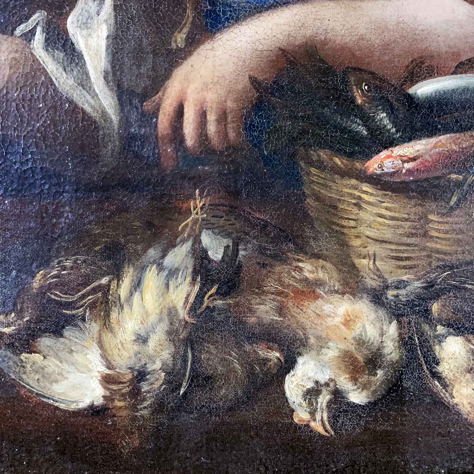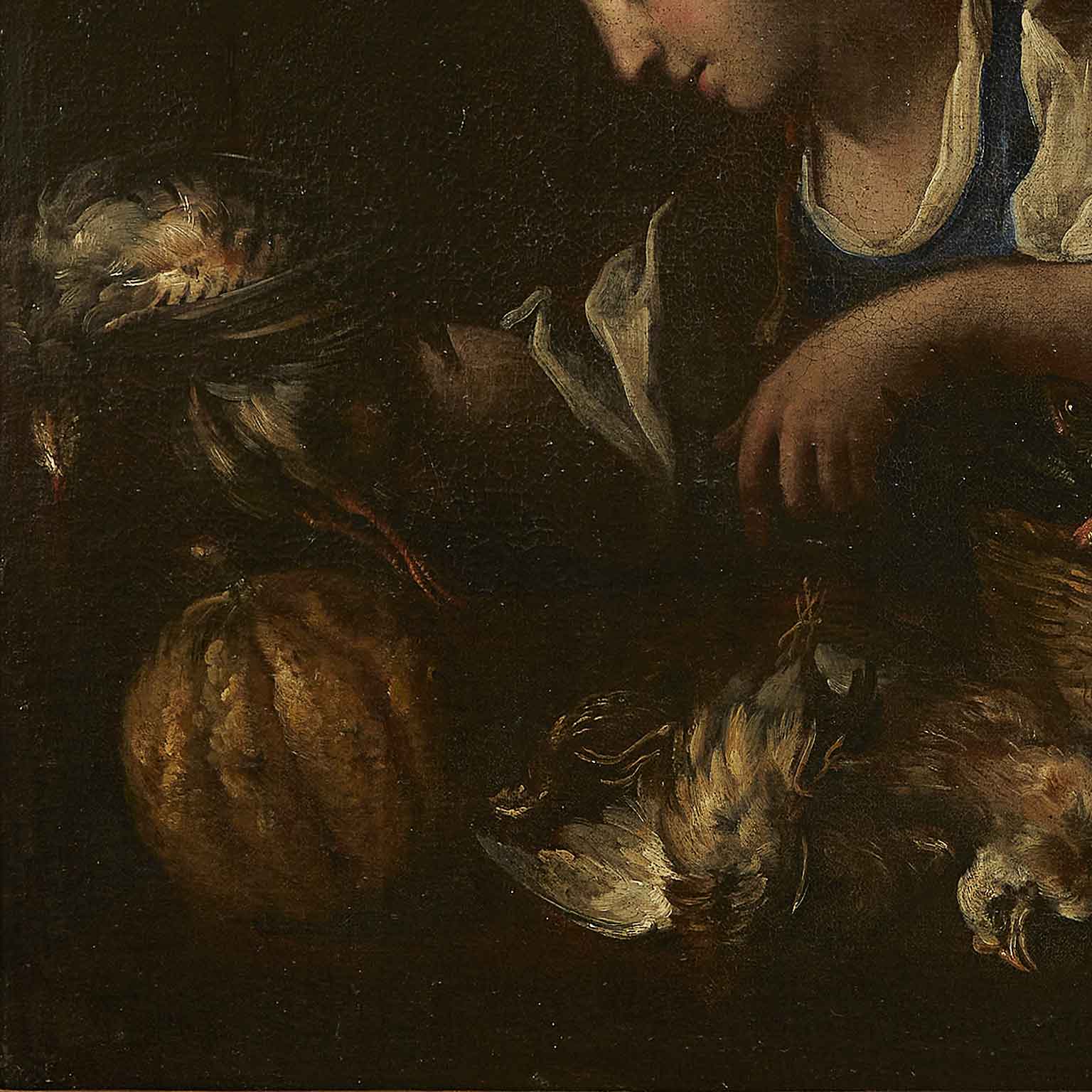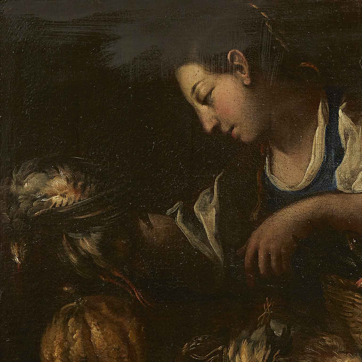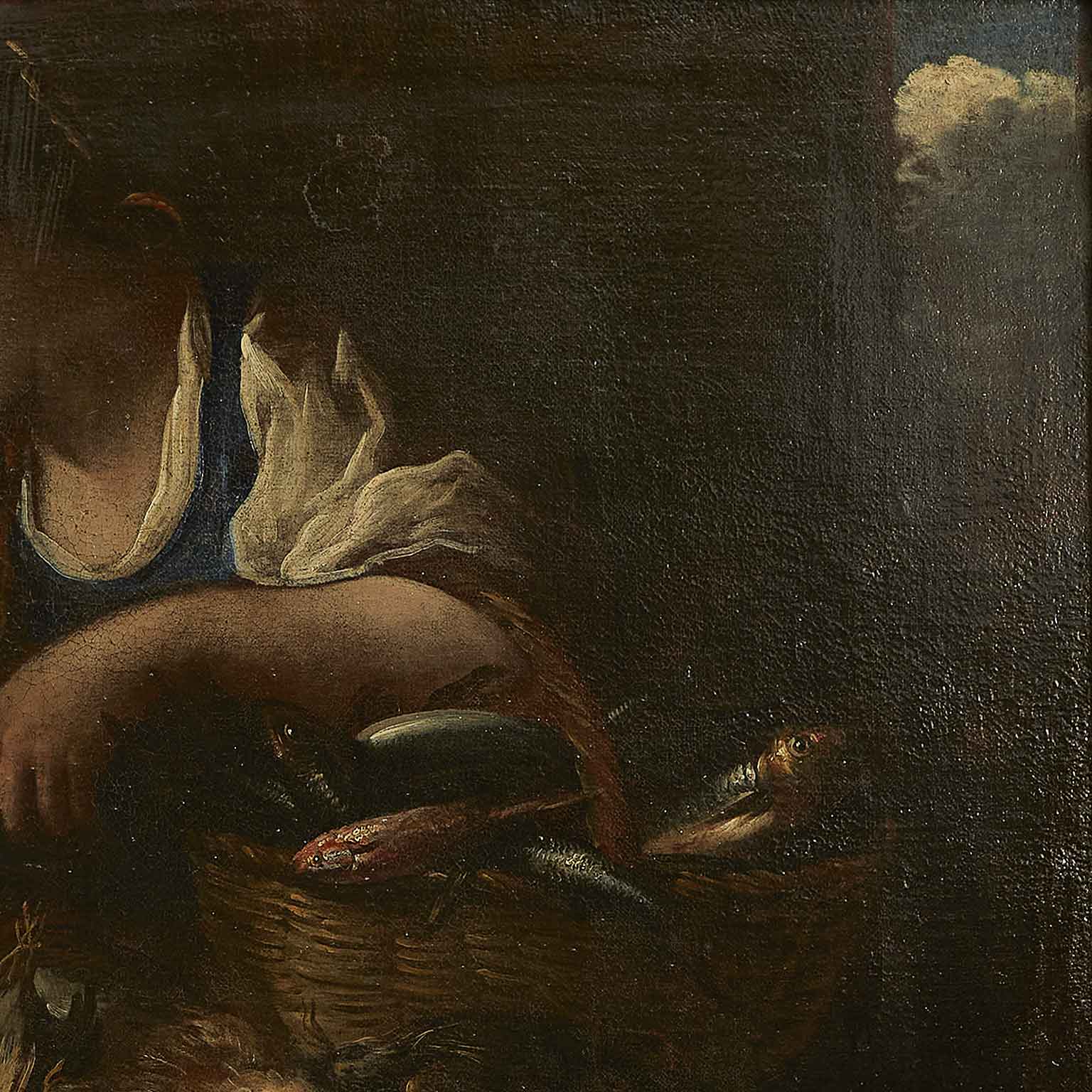 A painted work on canvas featuring a female figure with a wicker basket on her left arm, containing various types of fish and a bird held in her right hand. In the foreground, a composition of another bird, a pumpkin, and pears. The 17th-century painting originates from a Lombard residence and is presented in a contemporary frame, in good preservation condition consistent with its late 17th-century age.