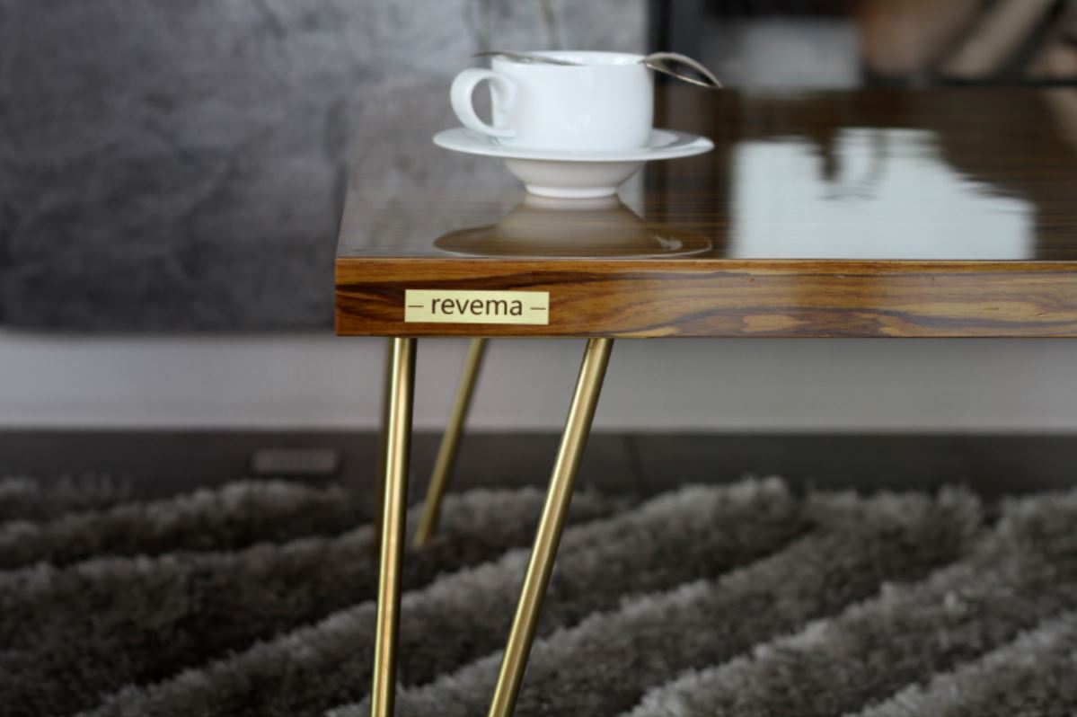 Revema furniture strongly reflects modernist design, with a noticeable influence from the best of the post-war era. Most importantly, the furniture currently in the brand's portfolio features a simple form that simultaneously dazzles viewers, much like works of art, with its finishing techniques. The solid tabletop creates the impression of being suspended in mid-air, supported by delicate metal legs in a subtly gold hue. Revema products are crafted with great care and precision.