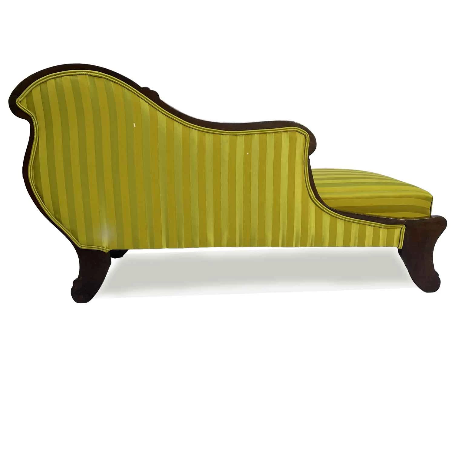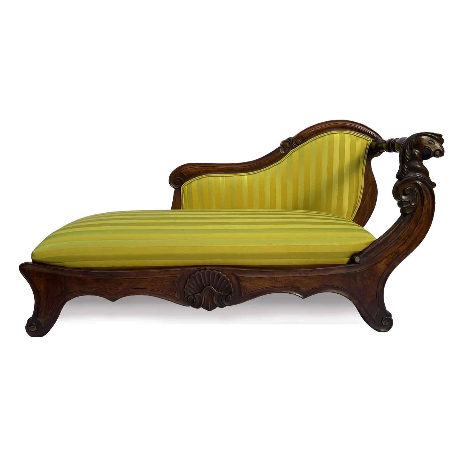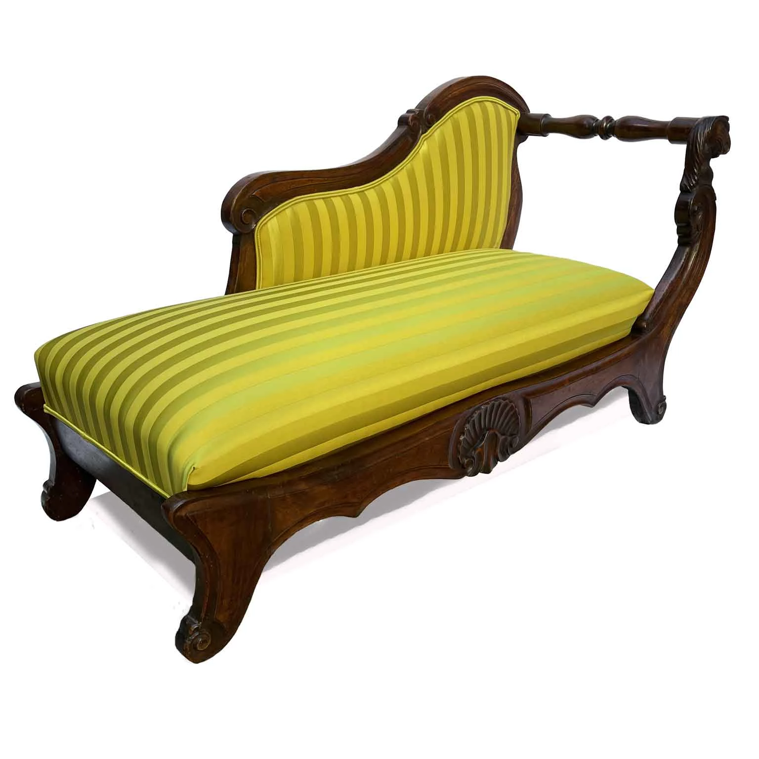 An unusually shaped sofa due to the absence of side backrests, featuring turned wooden crossbars in their place. The sofa has a sturdy structure made of walnut with a beautiful patina, with the front centered by a carved shell, and the front support of the side is carved with zoomorphic motifs; this small 19th-century triclinium or kosatka sofa has compact dimensions and has been fully restored, upholstered, and covered with yellow cotton striped fabric, as shown in the attached photographs.